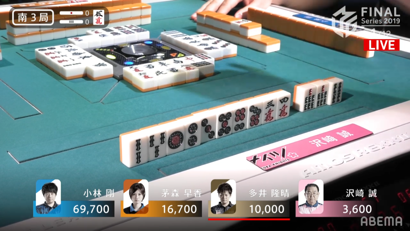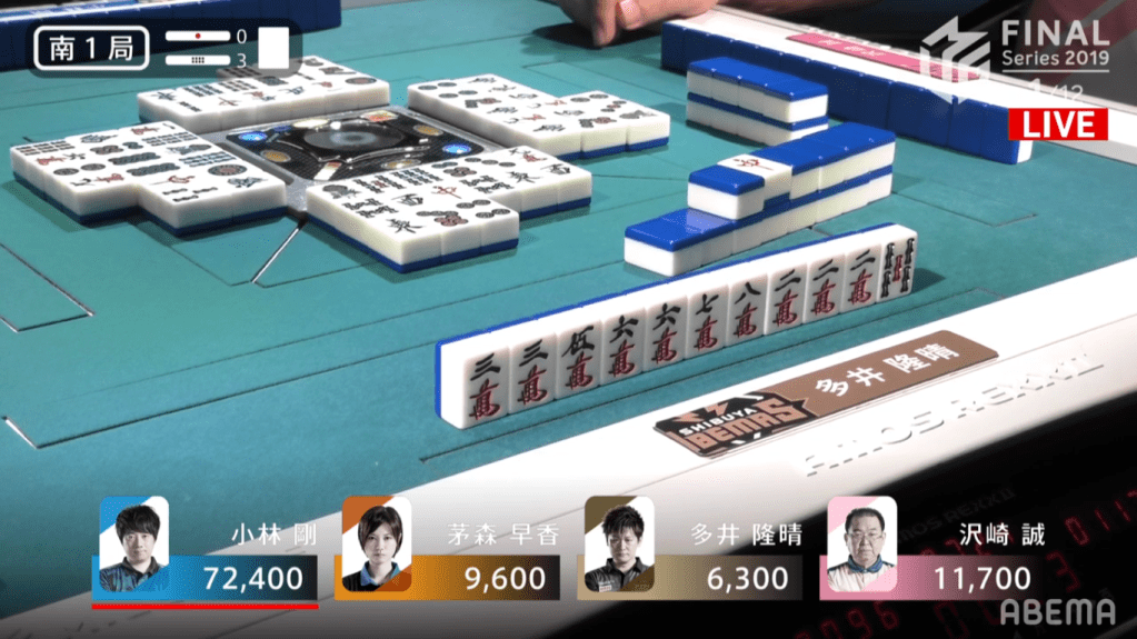 With Kayamori having the a dora pon, any hand that she wins would be worth 8000 minimum (kiriage mangan is present in M-League). Due to the lack of 3467s, there is still a good chance that she has a ryanmen wait. However, he does have a decent ryanmen wait. With three 6m visible to him, he knows that it’s difficult for other players to use 7m. If he deals in, that would put him 13700 behind 3rd and 19000 behind 2nd. After spending over a minute deciding whether or not to keep or throw the 5s, he decided to play it safe and threw the 6m.