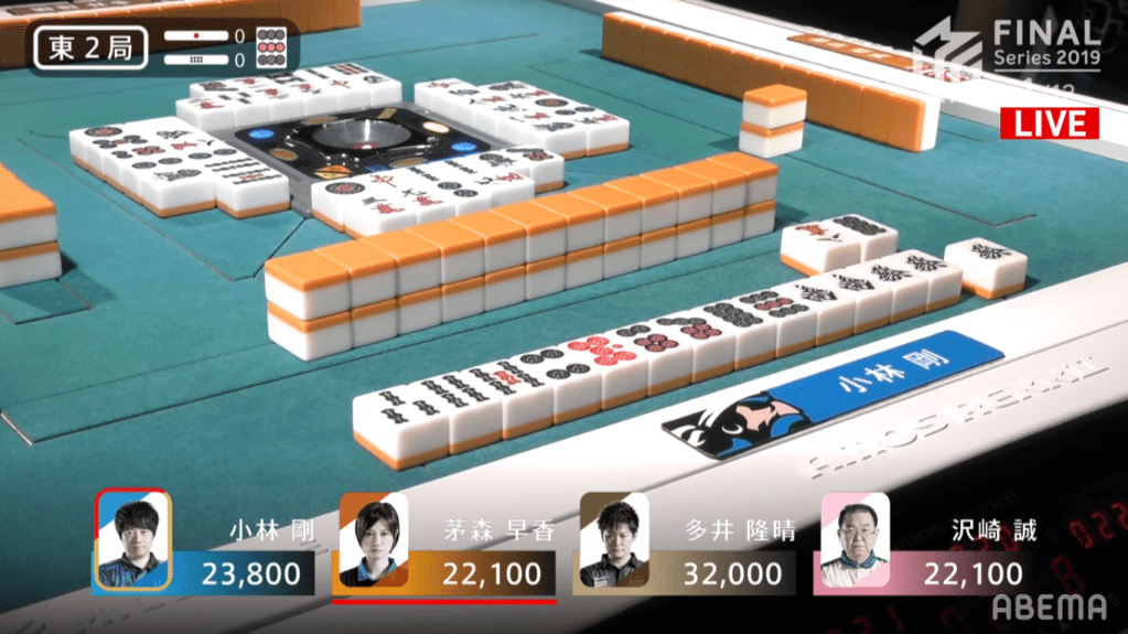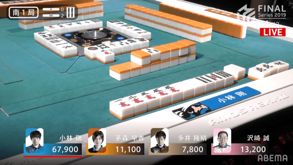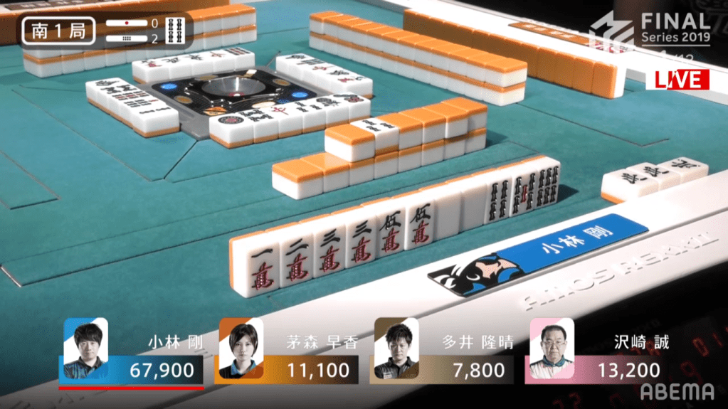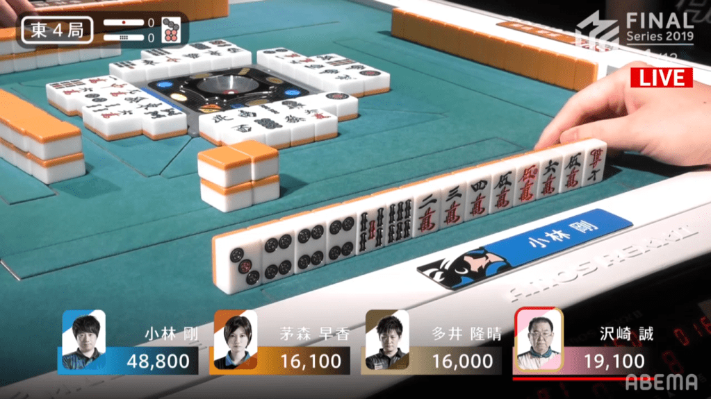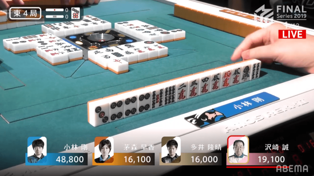 In E4-1, Kobayashi was the first player to hit tenpai. Kobayashi decided to go and riichi on the north tanki for Riichi/Dora 1. Because his wait was on an honour tile, people who are looking to push are more likely to deal in, while people who draw it and are looking to defend will have a very difficult tile to use in their hand. Despite this, Sawazaki was able to get his hand into tenpai, calling riichi on the 13th turn for Riichi/Pinfu/Dora 1. However, it was Kobayashi winning it out after Sawazaki dealt out the north wait. Kobayashi won that hand for 2600, plus 300 for honba and 1000 for Sawazaki’s riichi stick.