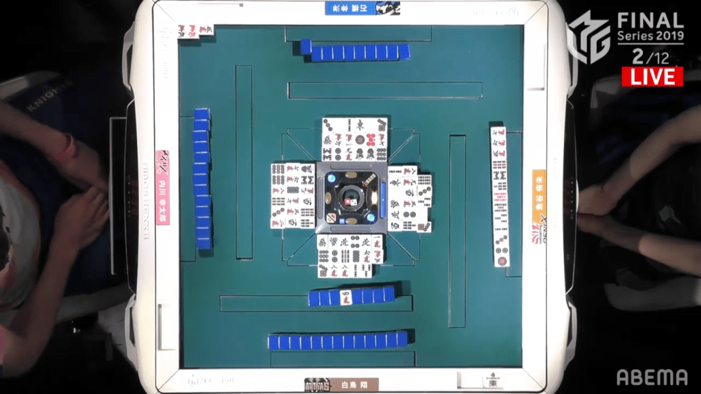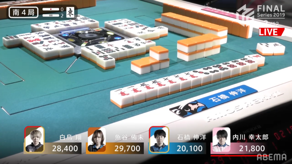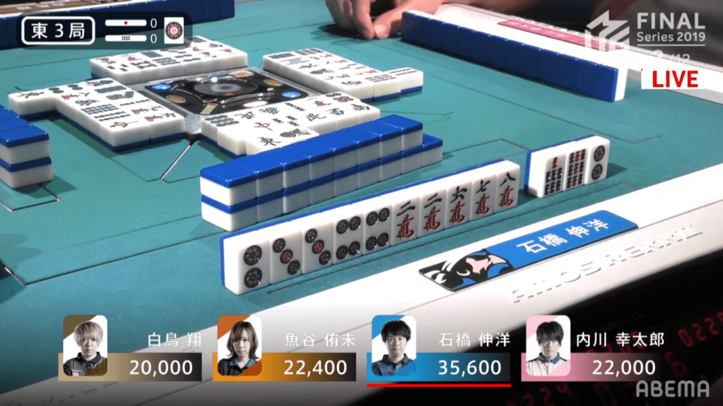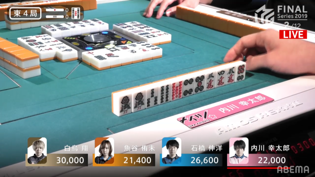 In S4-2, the distance between 1st and 4th is just 9600 points. With Shiratori 1300 points from 1st, he was the first to strike, calling riichi with a 25s ryanmen wait. To avoid losing placement, Uotani immediately bailed, throwing the genbutsu red 5p. Both Ishibashi and Uchikawa needed to push. With Ishibashi in 4th, he needed to get out of last so that he doesn’t undo the work that his teammate Kobayashi did in the last game. For Uchikawa, he needs to push to maintain the lead that the Sakura Knights had going into the finals. Ishibashi eventually got to tenpai, needing to decide whether to take a 36m ryanmen wait or 1m/5m shanpon wait . He chose the later, laying both a suji trap and a chance to win with Riichi/Tsumo/Sanankou. Soon after, Uchikawa discards the 1m and Ishibashi wins 1600+1000+600, avoiding last in true Pirates fashion.