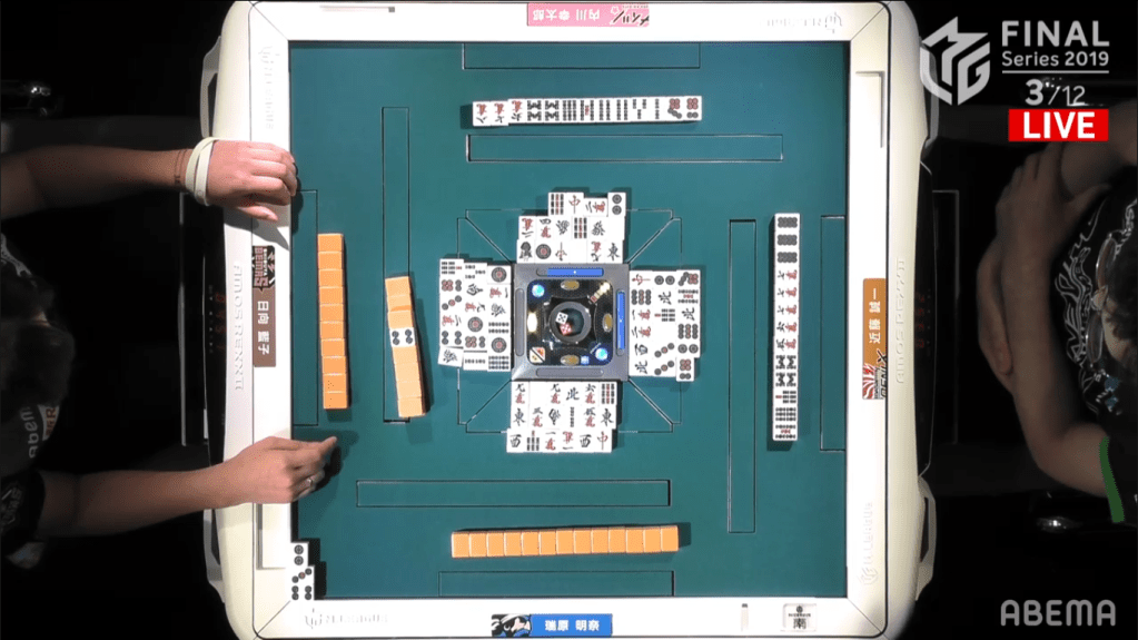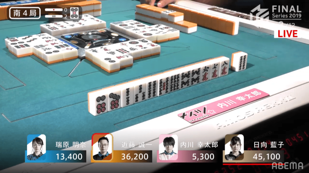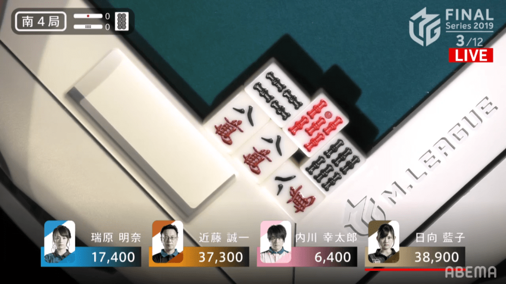 Kondo, who had already made two calls by this point and was in tenpai, drew the 1s. He took a bit of time to consider what to discard, and ended up discarding the 9m, avoiding a deal-in. Unfortunately for Mizuhara, her suuankou hopes were crushed when she drew the 2m and dealt into Hinata for 2900.
