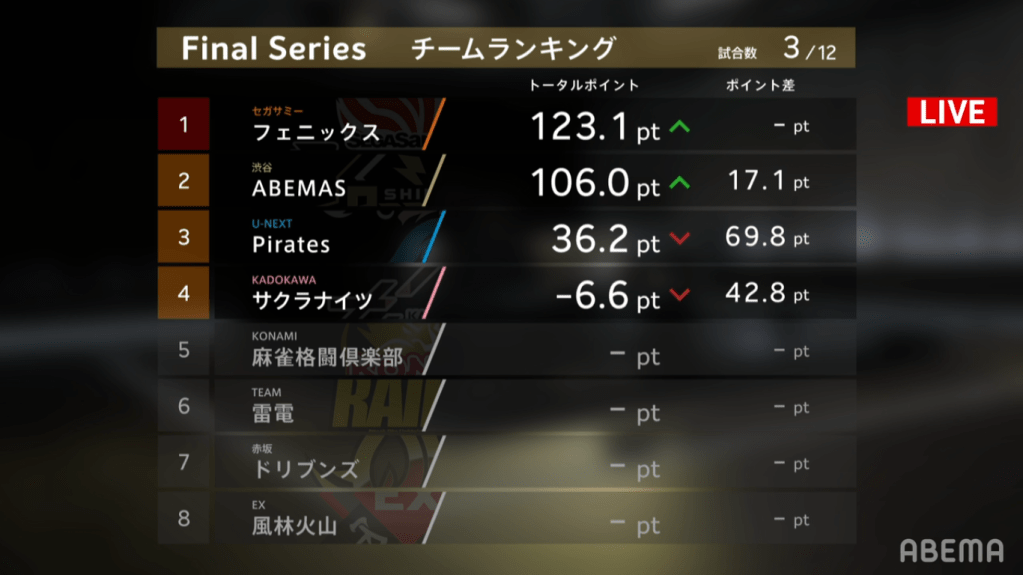 The Shibuya Abemas have gained considerable ground, though the Sega Sammy Phoenix are still adding points to their total.