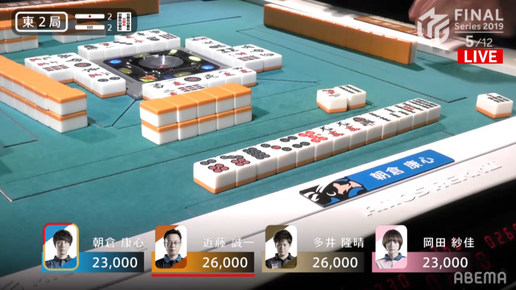 In S2-0, Kondo rushes out of the gate with a pon of east on turn. The other players don’t pay much mind to this, since they are building their own big hands. Okada, who gets to tenpai on row 3, calls riichi on her Riichi/Pinfu/Tanyao/Dora 1 hand. Shortly after, Asakura chases with a Riichi/Dora 3/Aka 1 hand. However, it was Kondo who ends up being victorious, winning with an East/Aka 1 hand for 2600 points.