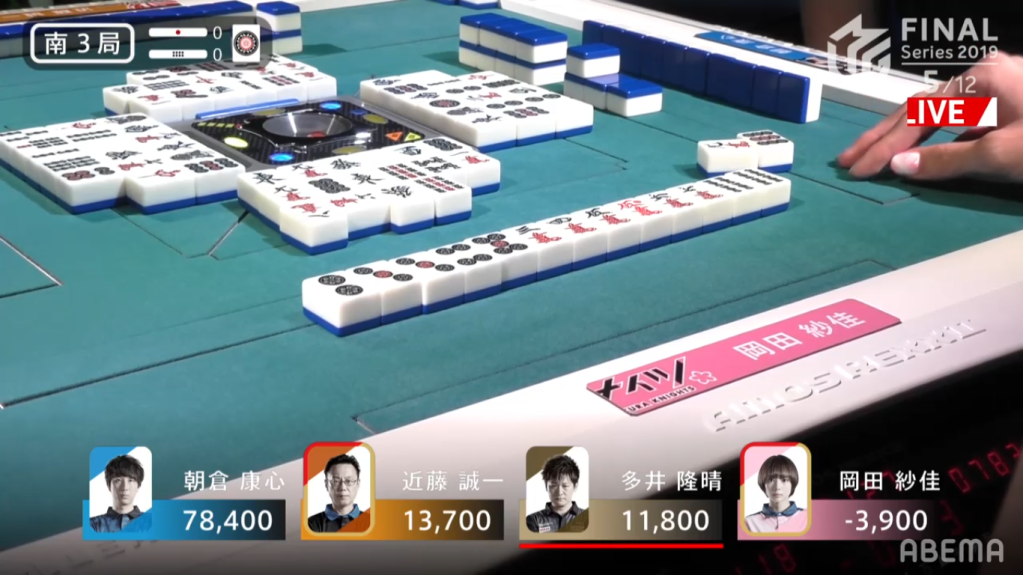 Going into S3-0, Okada was in last place, being negative after Asakura’s daisangen. Her team had already lost 4 games in a row and their team needed some points in order to have a chance to win the championship. Her hand develops quickly, with the hand being iishanten by turn 4. By turn 10, she has the chance to be tenpai. However, she chooses to go bigger, discarding the 9s to go for tanyao and the possibility for a better wait. She is faced with a threat from Kondo, though she pays no mind and continues her hand. Her hand eventually reaches tenpai and calls riichi, waiting on 14p. Okada ends up winning the hand off Kondo’s 4p for Riichi/Pinfu/Tanyao/Aka 1 and 8000 points.