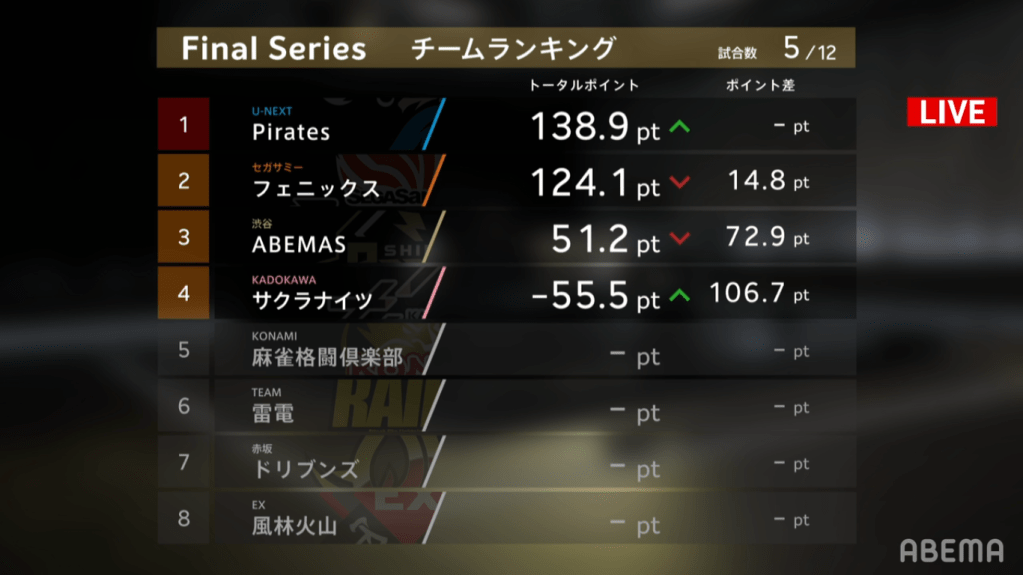 With the big boost from the yakuman, the U-Next Pirates shot up to 1st place. With Okada’s 2nd place, this is the first time the Kadokawa Sakura Knights have gained points.