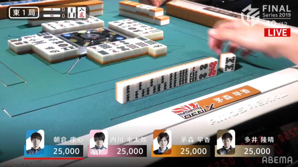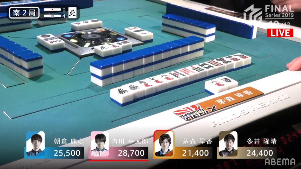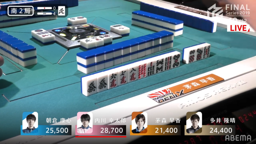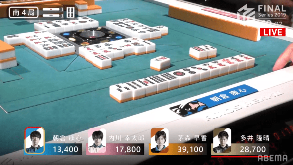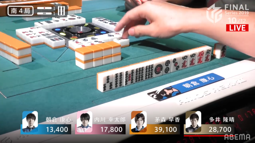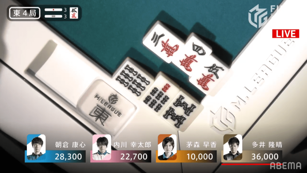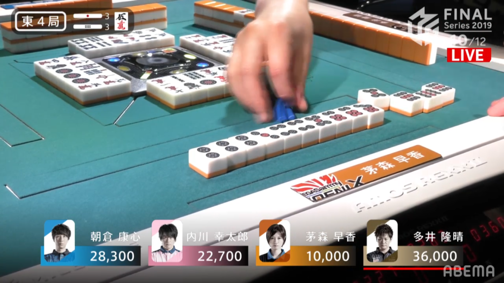 She noticed that Ooi was continuing to push, meaning that if the hand did go to a draw, Ooi would be in tenpai and the game would continue, giving Ooi another chance to win the game. She also knew that dealing into a haneman would lose her 1st place. Asakura only needs a 5200 hand or a mangan to get out of last, and would need a baiman ron or better to get into 2nd. Weighing the facts, Kayamori discarded the 3m, arguably trying to intentionally deal in (also known as sashikomi) to end Ooi’s dealer turn and win the game. The gamble works, with Asakura winning the Riichi/Pinfu/Dora 1/Aka 1 hand for mangan to get out of last and Kayamori maintaining her 1st place to win the game.