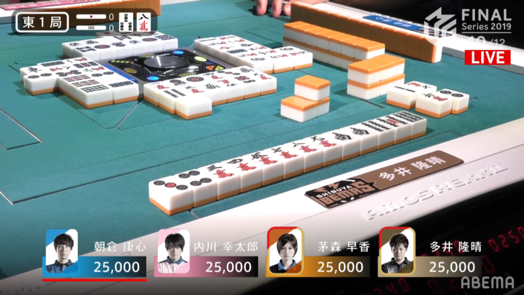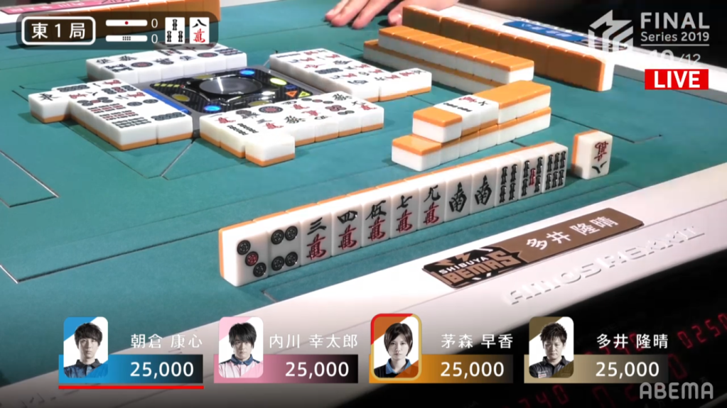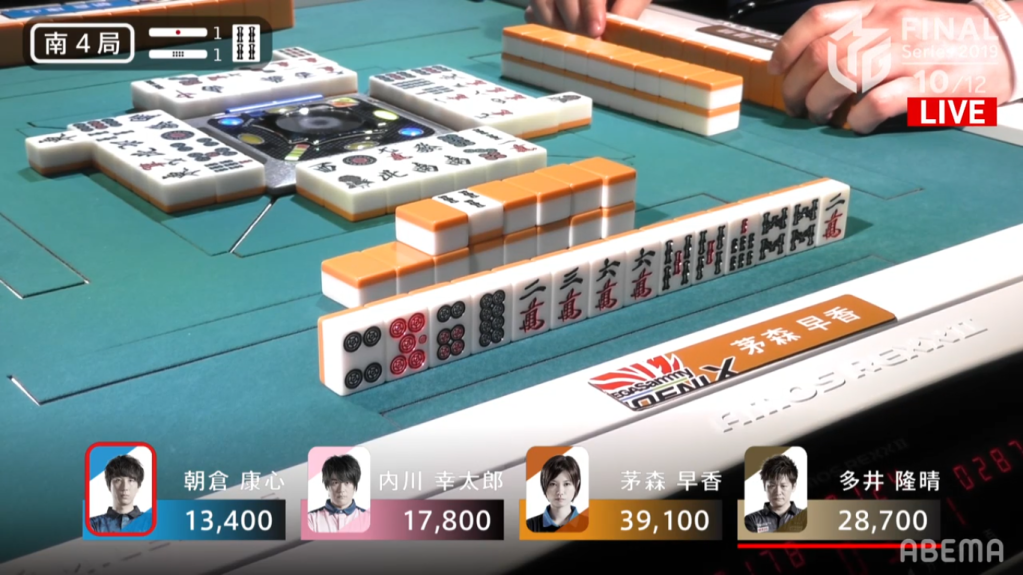 In E4-3 the points up for grabs was 3900. The previous three hands went to a draw, accumulating riichi sticks in the process. With the equivalent of a 3 han hand in bonus sticks available, the players aimed for quick hands. Asakura’s hand had a few ryanmen waits for tanyao, but could spell trouble if he drew the wrong side. Kayamori had a haipai filled with pinzu, naturally leading her to aim for Chinitsu. Both Kayamori and Asakura made early calls and to iishanten before the end of the 1st row. Asakura got to tenpai first when he made his second call, waiting on a 25p wait. Kayamori got to tenpai in the middle of the 2nd row, waiting on the 58p and holding 4 of Asakura’s winning tiles. With the other two players bailing, it was all a battle to see who would draw their winning tile first. In the end, it was Kayamori winning with a big Chinitsu hand to win the big pot for 2000+300/4000+300, along with the three riichi sticks (which also got him out of last place and back in the running).