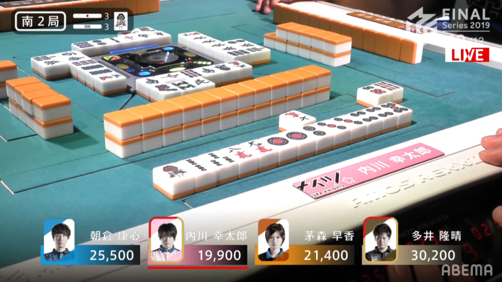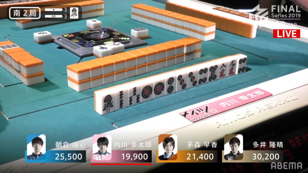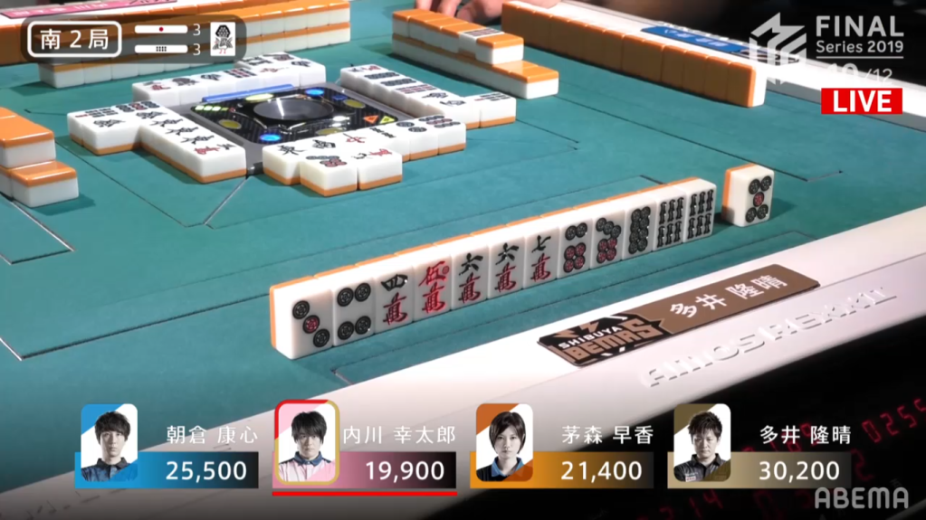 In S2-3 the points up for grabs was 3900. The previous three hands went to a draw, accumulating riichi sticks in the process. With the equivalent of a 3 han hand in bonus sticks available, the players aimed for quick hands. Uchikawa has an iishanten haipai, a blessing as the dealer looking to take the pot. On turn 2, he draws to tenpai and calls riichi, waiting on the 7m. Both Kayamori and Ooi continued to push their hand, with Kayamori getting to tenpai first waiting on the 4p. When Ooi got to tenpai shortly after, he called riichi waiting n the 58m for a guaranteed mangan. This plan backfires on Ooi when he draws Uchikawa’s winning tile on his very next draw. Uchikawa won the hand with Riichi/Dora 1 for 3900+900, along with the three riichi sticks on the table and Ooi’s stick.
