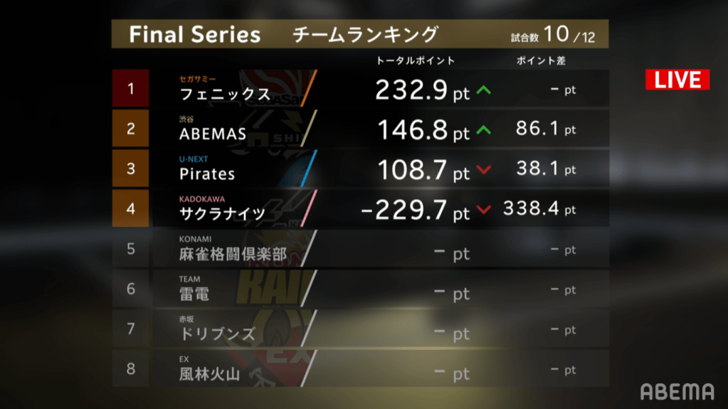 With another Phoenix win, they separate themselves from the pack, putting them 86.1pts ahead of the 2nd place Abemas. The Pirates lost some points, but they are still within reach for the top. With Uchikawa’s 4th loss in 4 games and the team’s 7th loss in 10 games, it looks like the Sakura Knights will not be winning any prize money this year, being 338.4pts from 3rd place.