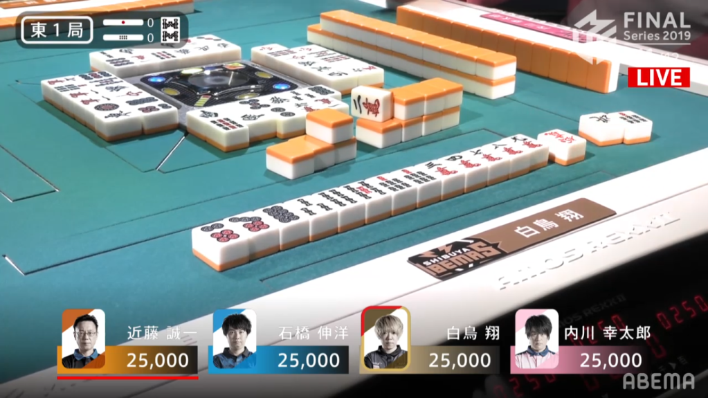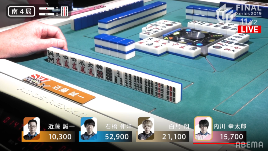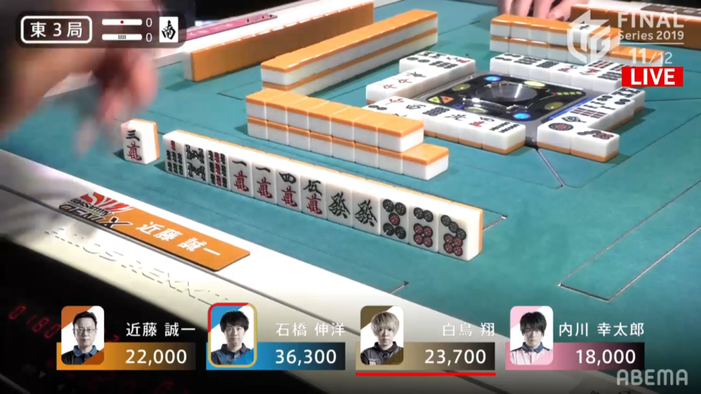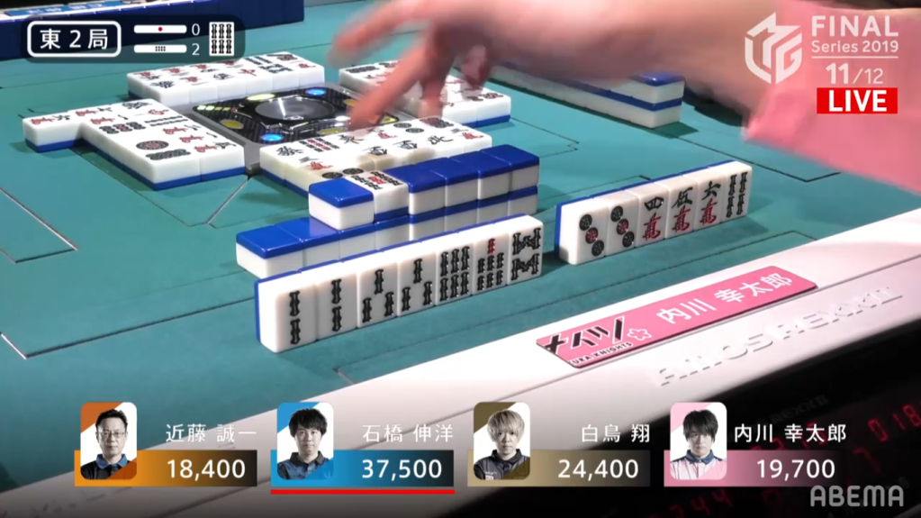 Ishibashi starts off with an ankou of dora, while Uchikawa has an ankou of east and a hand leaning towards honitsu. As the draws kept coming, Uchikawa’s hand draws a souzu ryanmen, having to change his honitsu plans. As the turns kept going, Shiratori got to tenpai first, calling riichi with a pinfu hand waiting on the 25m wait. Despite the riichi, both Ishibashi and Uchikawa managed to get their hands to iishanten. Shiratori, however, won the hand before they could get to tenpai, drawing a red 5m himself to get a Riichi/Tsumo/Pinfu/Aka 1 for 1300/2600.