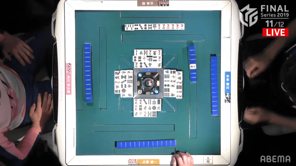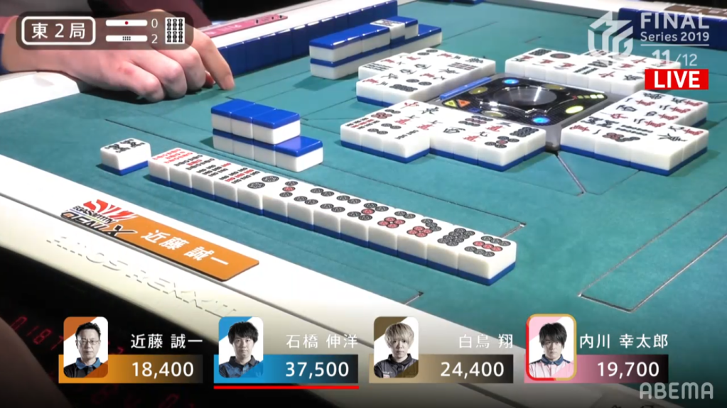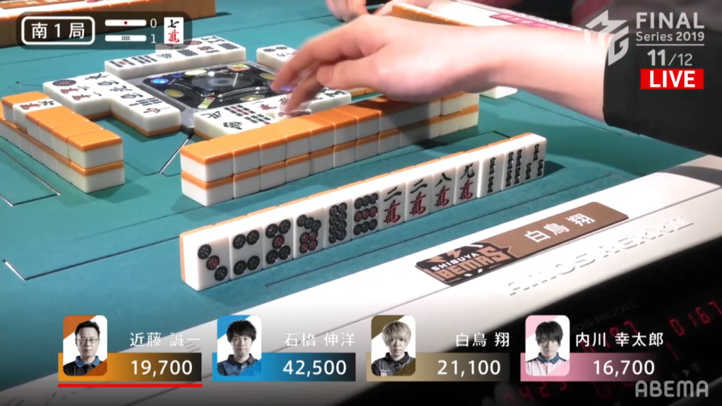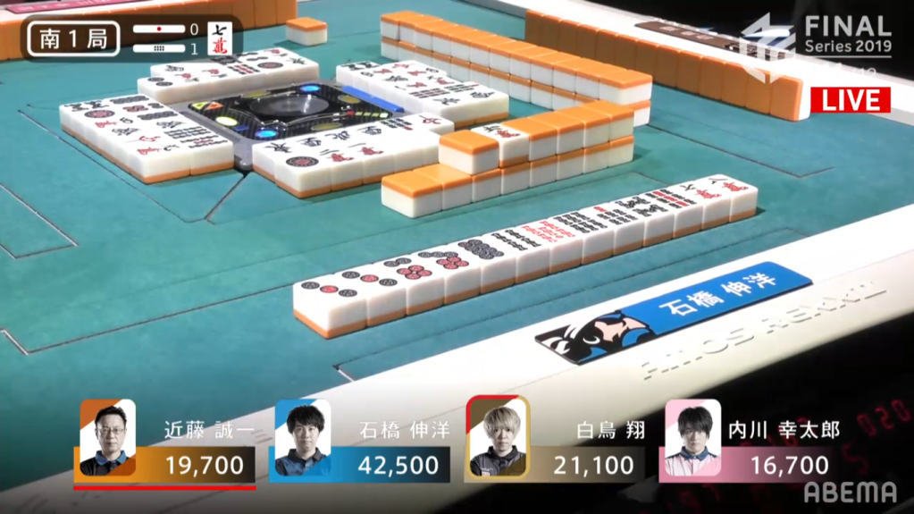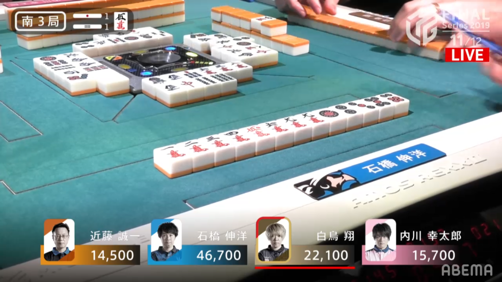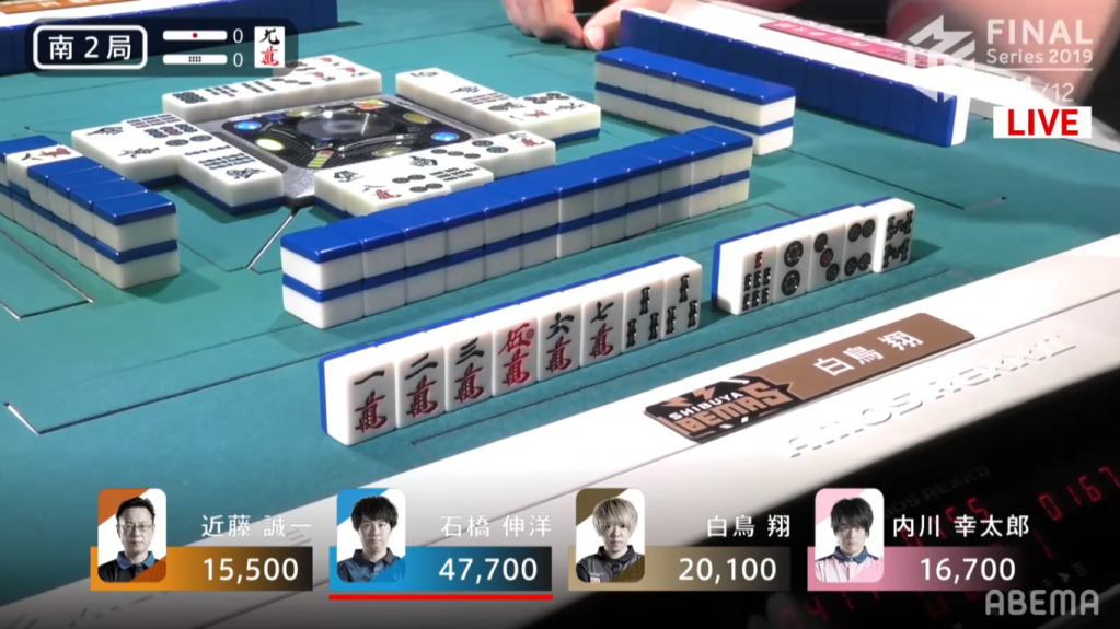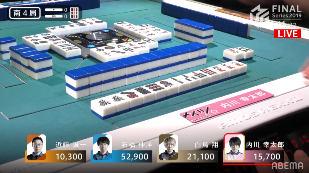 Uchikawa started the hand with chiitoi 2-shanten, which isn’t very fast for a dealer who wants to win a quick hand. To speed up his hand Uchikawa calls pon on the East to go away from chiitoi and go for any hand he wanted. Ishibashi, on the other hand, sticks with his chiitoi and gets to iishanten. On this path to iishanten, he had to discard the red dragon, which Uchikawa called pon to bring his hand closer to tenpai. When Ishibashi eventually got to tenpai, he waited on the 7p tanki. With better draws, he switched to a 1m, which he switched for a south later on. Uchikawa, who was iishanten for East/Red Dragon/Honitsu, drew and discarded the south, giving Ishibashi the 1600+300 win to end the game.