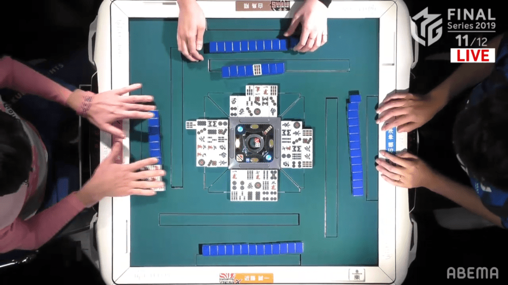 Ishibashi holds the red 5m double dora in his haipai, while Uchikawa has a pair of green dragons and a pair of easts. With Uchikawa’s hand developing quickly, he gets to iishanten on turn 3. Ishibashi’s hand is similarly fast, getting to iishanten at the end of the 1st row. In order to rush the hand, Kondo calls 6m to complete his 567m group in order to rush a tanyao. When Ishabashi gets to tenpai, he stays dama with a 47p ryanmen wait to try for a sneaky Pinfu/Dora 1/Aka 1 win. When Uchikawa gets to tenpai, he stays dama to try to improve his hand to also include chanta. Shiratori gets to tenpai, he has a decision of whether to go for a good wait riichi nomi or try to improve with dama. If he stays dama, he could improve his hand to include pinfu, tanyao or possibly sanshoku. However, a simple ryuukyoku would also land him a similar amount of points. Shiratori decides to instill fear into his opponents and calls riichi, waiting on the 14m. Uchikawa bails his hand after the riichi, having no safe way to keep his tenpai. Kondo tries to bail as well, discarding the genbutsu 7p against Shiratori’s riichi. To his surprise, he deals into the dama Ishibashi who wins the hand with for Pinfu/Dora 1/Aka 1 and 3900+300+1000, taking Shiratori’s riichi stick with him.