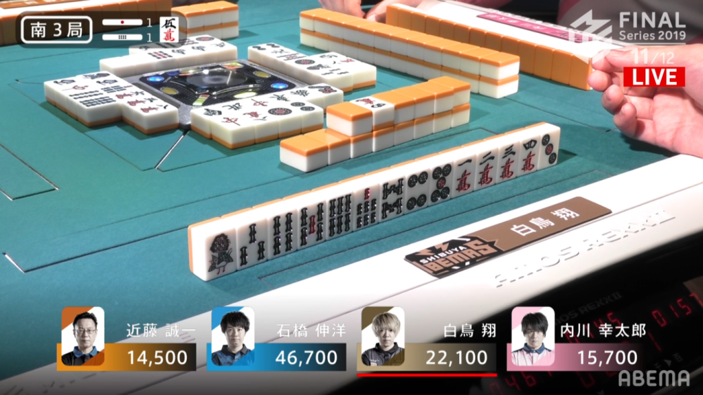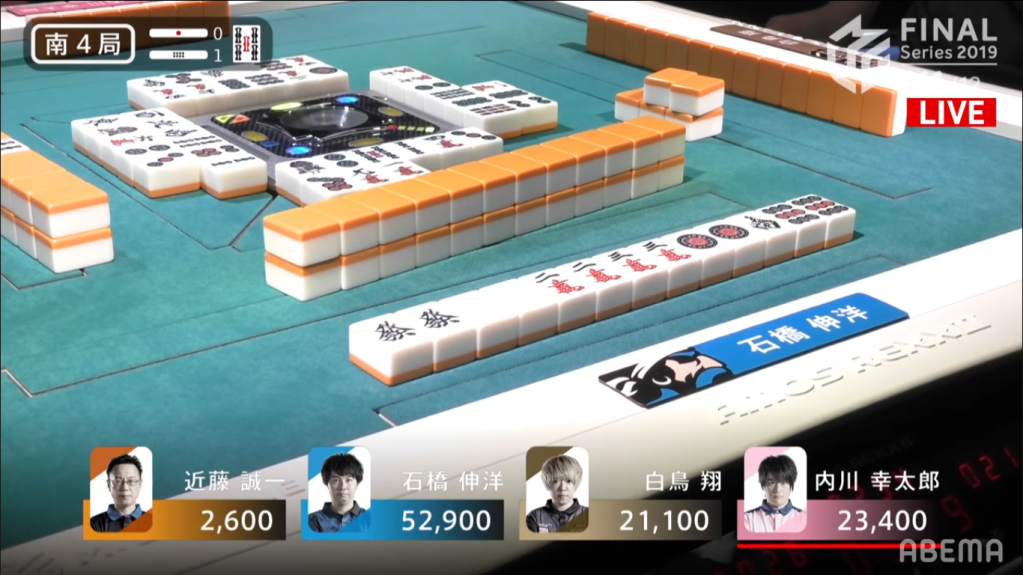 Ishibashi starts off the hand with another 2-shanten hand, while Uchikawa starts with a pair of souths. Kondo hand, which was far from tenpai to start with, miraculously fills in all the spaces and gets to iishanten in 5 draws. The draw after he got into iishanten was painful, since it would have put him into tenpai if he had just chosen the other wait (as the commentators said it, “Itai! Itai! Itai!”). Shiratori also gets to iishanten, eventually getting to tenpai and call riichi 7m penchan wait. With Ishabashi working in silence, he gets to tenpai and stays dama, waiting on a 69m ryanmen wait. Kondo, who has an isolated 9m in his hand, discards it to advance his hand and be safe against the riichi. Unfortunately for him, Ishibashi wins off the 9m for Pinfu/Dora 1/Aka 1 for 3900+300, also taking Shiratori’s riichi stick.