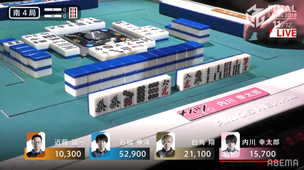 Being last in S4, he needed to win the hand to get out of 4th place. Since Uchikawa was dealer, he could plan to delay it and try to win the next hand instead. However, an Uchikawa tenpai at ryuukyoku would put Kondo out of mangan range and would have to rely on haneman or a direct hit to move placement. After thinking for a while he decides to push and discard the 8s, which immediately deals into Uchikawa. Uchikawa wins the hand with Riichi/Ippatsu/Dora 1 for 7700 points and moves into 2nd place.