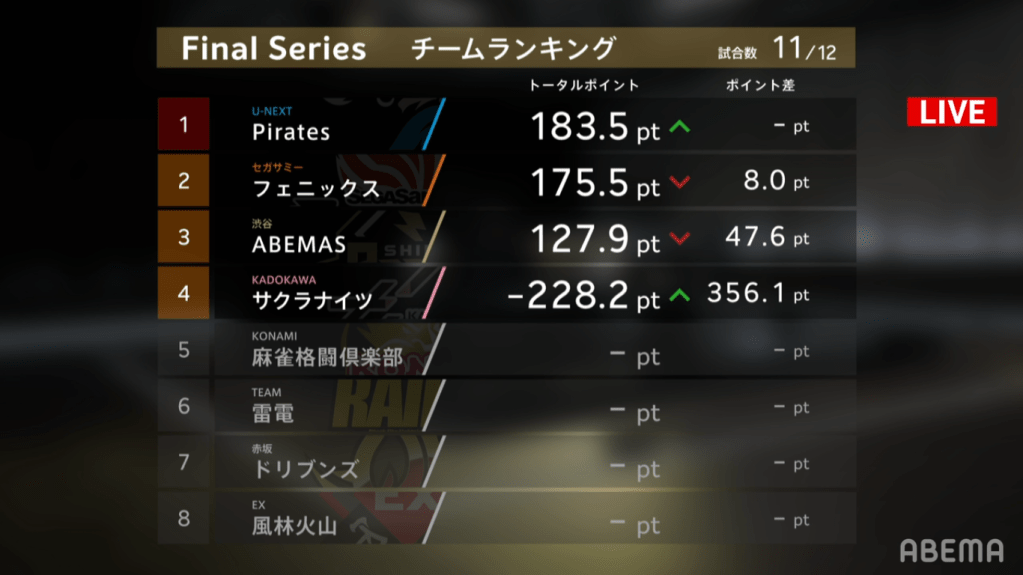 With the Pirates getting 1st place, they put themselves on top of the standings. With the Phoenix only 8.0pts from the top and the Abemas only 55.6pts from 1st, the competition becomes intense. Whichever of the 3 teams wins the next game will more than likely win the championship!