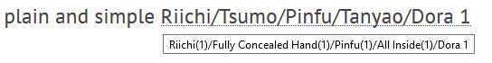 To help make the blog easier to read, we have put in mouseover translation for those who are more familiar with the WRC terms. When viewing on desktop (sorry phone users), you will see some terms with a dotted underline below them, you can mouse over these terms to see the WRC translation or the definition of these terms. Not everything is translated though, so use the Arcturus Japanese Mahjong Wiki for anything you don’t know.