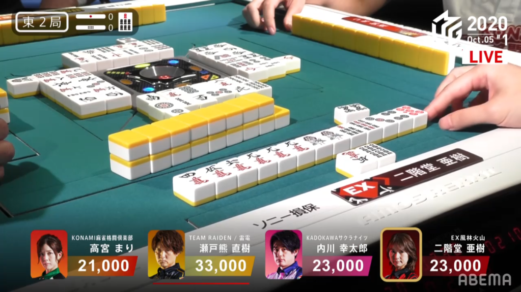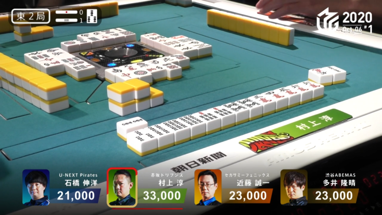 In E2-1, Murakami was in the lead and looking to increase his lead with his dealer turn. Murakami starts with an easy callable hand with a dora. With his opponents not giving him any of the tiles he needed, Murakami continued to improve his closed hand. Eventually, Murakami gets to tenpai, stays dama on a 25s ryanmen wait for mangan. However, as Kondo continued to call and push, Murakami decided to call riichi to slow him down. Kondo didn’t stop, discarding a red 5m right after. The turn after, Kondo drew and discarded the 2s, dealing into Murakami. With two ura dora, Murakami’s hand went up to a haneman. Murakami wins the hand with Riichi/Pinfu/Tanyao/Iipeikou/Dora 1/Ura 2 and 18,000+300.