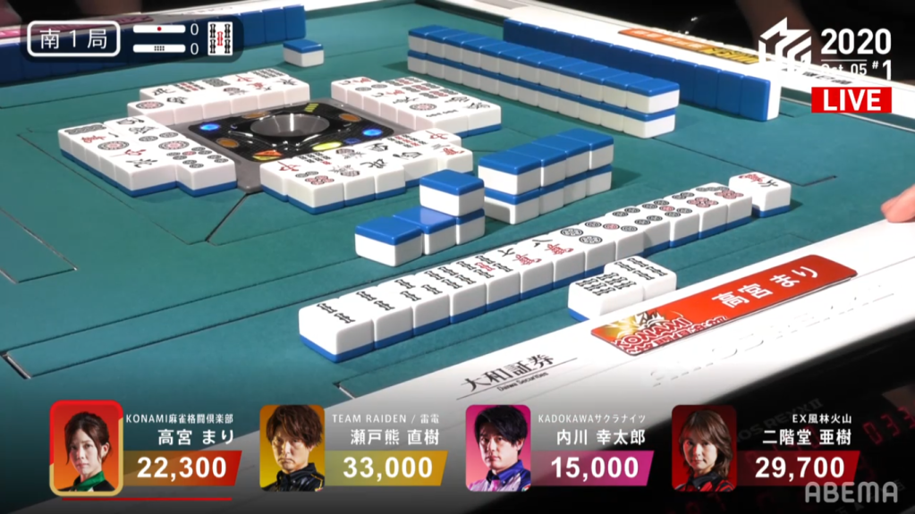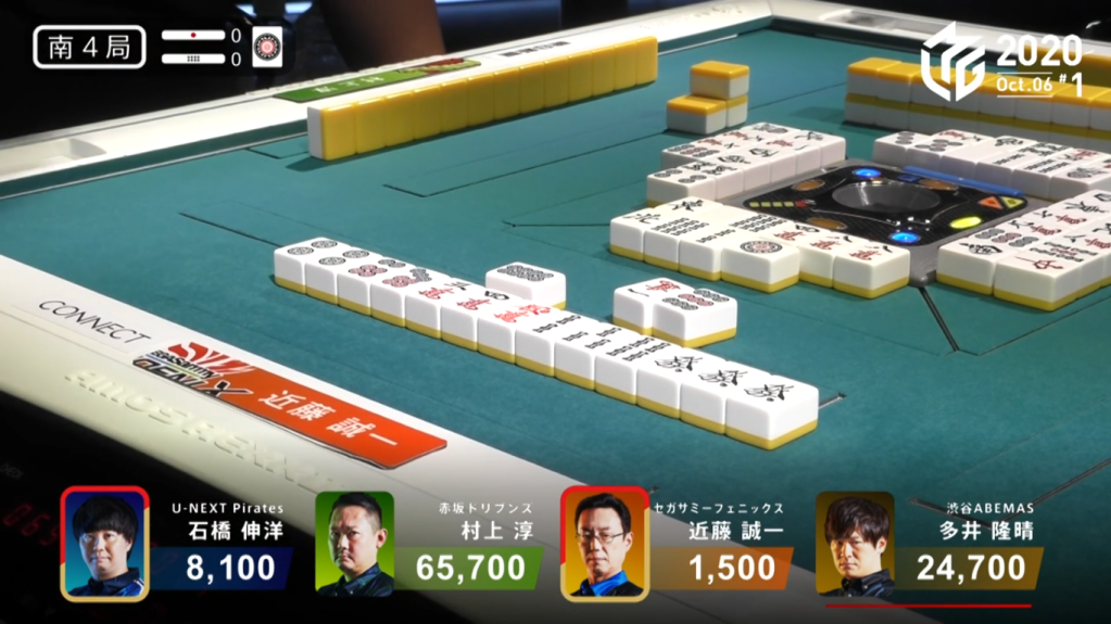 In S4-0, Kondo is in last place, 6,600 points behind 3rd place Ishibashi. He needs to win a 4/30 indirect hit or tsumo, or a 3/30 direct hit. Kondo’s haipai starts out strong, holding a green dragon ankou and four clear blocks. Unfortunately, the hand doesn’t have much value in order to move placement. He proceeds as one usually proceeds, discarding honours and work with tile efficiency. Drawing a red dora and holding a regular dora, his hand reaches 2-shanten, but still not enough value to open his hand. Completing other blocks, he eventually reaches tenpai with a closed hand. He calls riichi with a 58p wait, but has to give up the regular dora. With only three han, Kondo puts his hopes into drawing the tile himself, getting Ippatsu or getting ura dora to bring it up to four. Ishibashi, who had been staying dama with a good 69s wait, calls riichi after him since he has nothing to lose. The riichi battle ends quickly, with Murakami dealing the 8p to Kondo during his ippatsu turn. Kondo wins the hand with Riichi/Ippatsu/Green Dragon/Aka 1 for 8,000, surpassing Ishibashi and taking his riichi stick with him. It goes to show that Kondo didn’t win the 4th place avoidance prize last season for nothing.