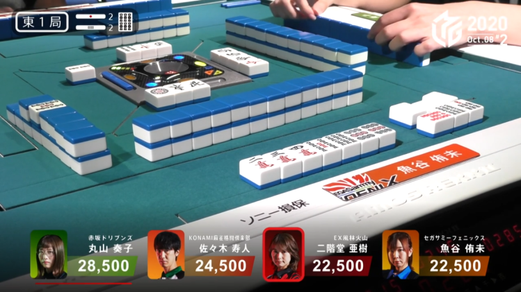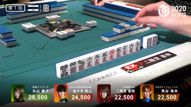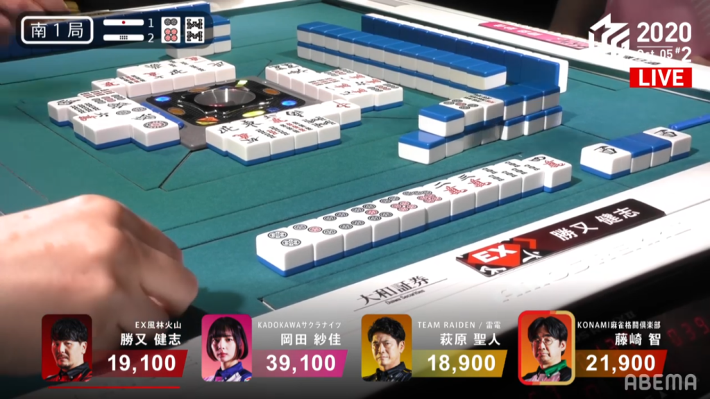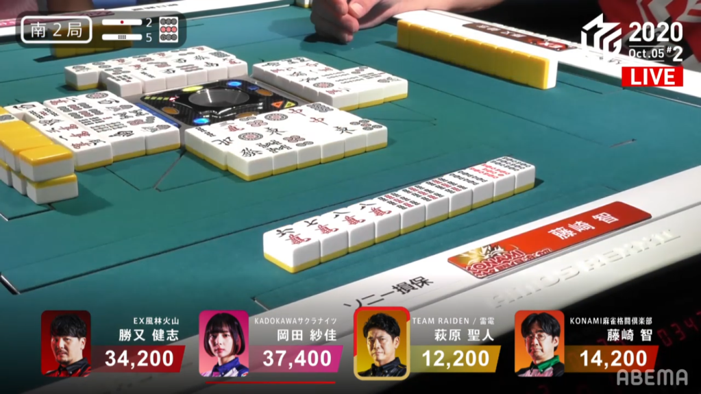 In S2-5, Fujisaki is only 2,000 points from last place. With two riichi stick and five honba on the table, whoever wins the next hand will win an extra 3,500 points.
