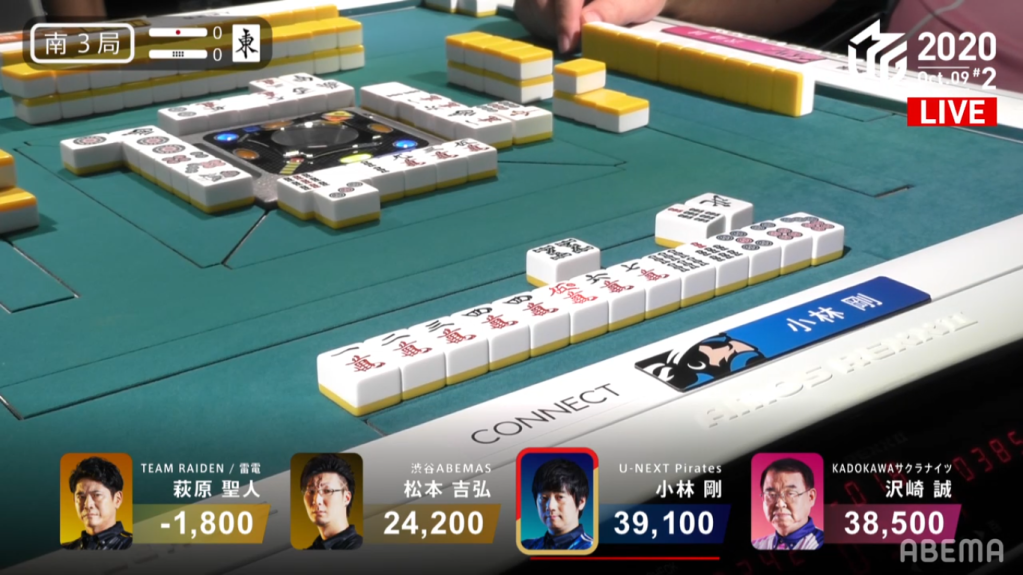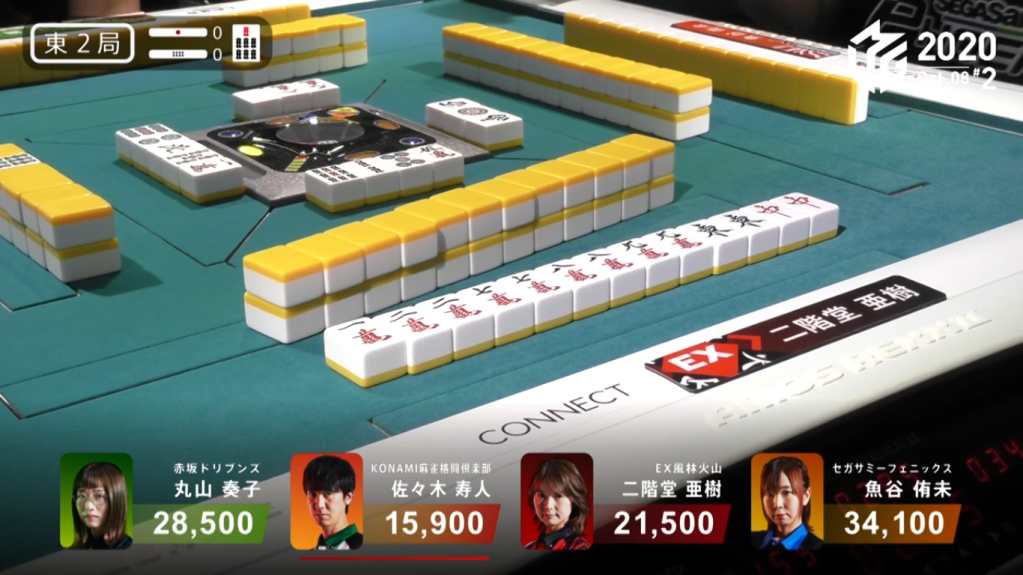 In S2-2, Sasaki does some standard speedy efficiency to continue his dealer turn and win the hand with a Riichi/Tsumo/Pinfu/Dora 1 for 2,600+200 all.