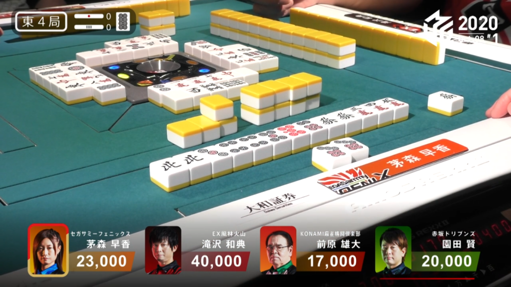 In E4-0, Kayamori starts off with two yakuhai pairs and a red dora,indicating an easy callable hand. However, Kayamori manages to stay closed and calls riichi on the Green Dragon/North shanpon. With honour waits, the north easily came out and Kayamori won with a Riichi/Ippatsu/Green Dragon/Aka 1 for 8,000 points.