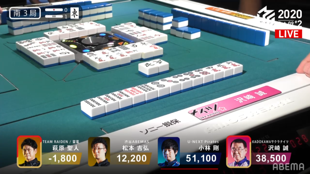 In S3-1, it’s Sawazaki’s turn to try to catch up. Sawazaki progresses his hand in the normal fashion, along with Hagiwara who is trying to catch up to Matsumoto in 3rd. Sawazaki is the first of the two to reach tenpai, calling riichi with a 147p sanmenchan. Hagiwara later chases with a 58s ryanmen. Luck was again not with Hagiwara, as he deals the 1p on his ippatsu turn. Sawazaki wins the hand with Riichi/Pinfu/Sanshoku/Aka 1 for 8,000+300, plus Hagiwara’s stick.