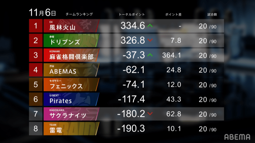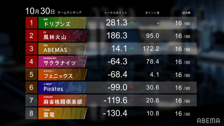 Without a doubt, the biggest winner this week is the EX Furinkazan. Going 2/2/0/0 this week, they were able to gain 148.3 points this week alone and take 1st place from the Akasaka Drivens. The next biggest winner is Konami Mahjong Fight Club, who went 2/0/1/1 this week to earn 82.3 points and make their way from 7th to 3rd.