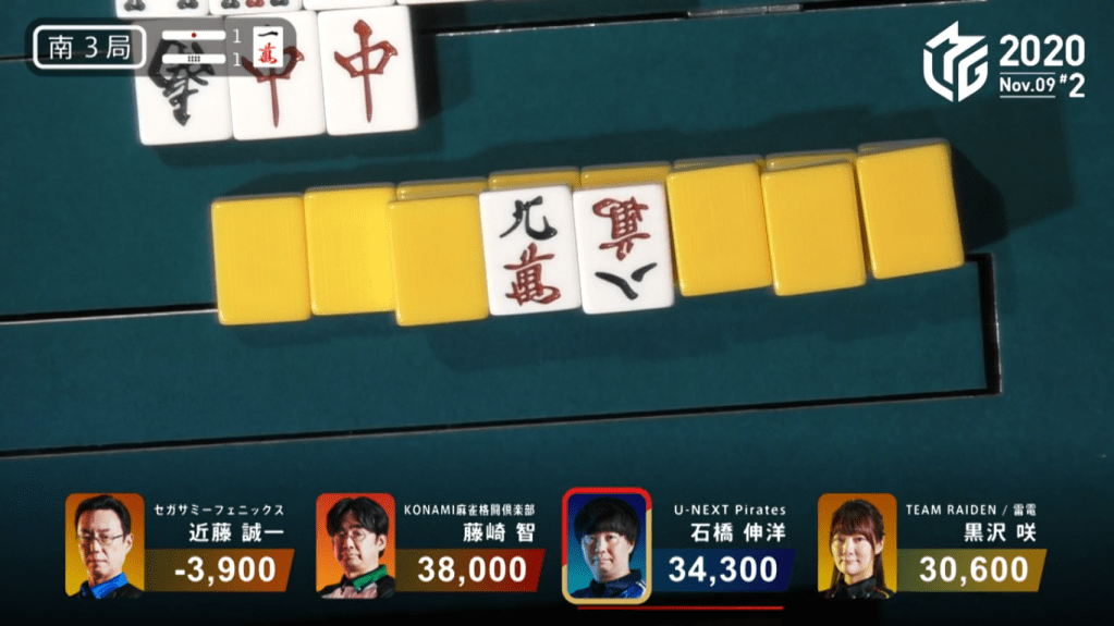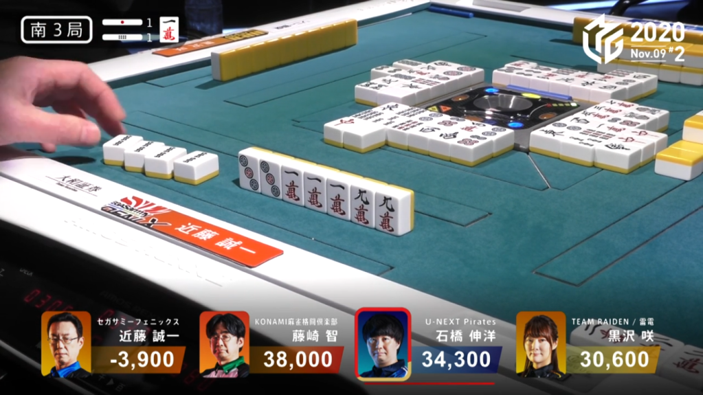 Ishibashi decides to go the safer route and throw the south. Unfortunately, Kondo throws the 4p and Kurosawa wins the hand for 5,800. If Ishibashi had thrown the white dragon, atamahane would be in place and he would have won instead of Kurosawa and end the game in 2nd.