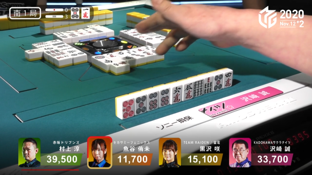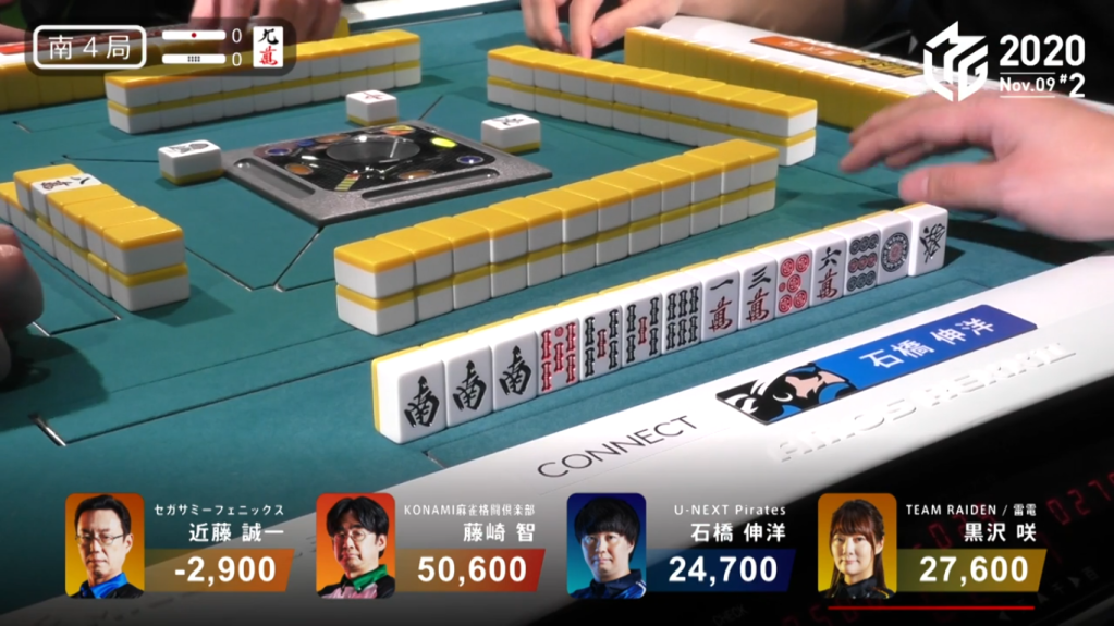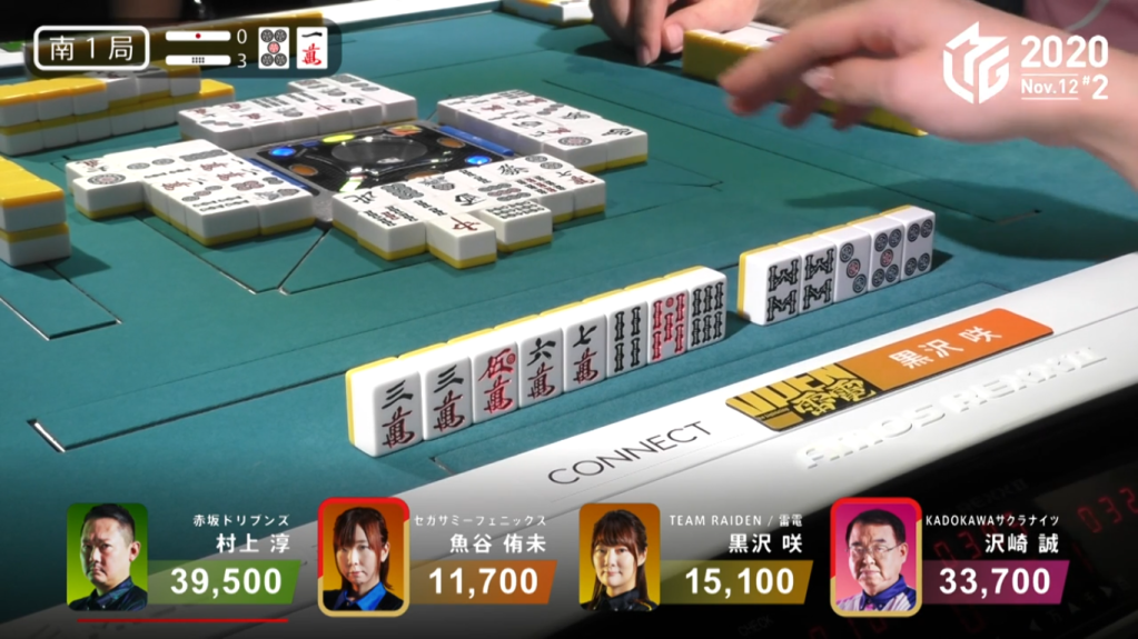 In S4-0, 3rd place Ishibashi is behind 2nd place dealer Kurosawa by 2,900 points. In order to pass her, he would need a 3/30 general ron or a 2/30 tsumo or a 1/50 direct hit. Ishibashi starts out very well, holding a south and 5s ankou, as well as a two red dora. By turn 5, Ishibashi is iishanten with 21 total tiles that would get him to a good wait tenpai. However, he was unable to find any of them within the first two rows. Kurosawa develops her hand while Ishibashi waits and becomes tenpai before Ishibashi. Kurosawa calls riichi on a 47p ryanmen to put the fear of a dealer riichi on the table. Ishibashi continues to wait as Kondo, who is deep in 4th place, calls a chasing riichi waiting on a 3s/8m shanpon, putting Ishibashi under extreme pressure. Ishibashi calls chii soon after to get to tenpai on a 47p ryanmen. However, Ishibashi is faced with a big decision on the very next turn.
