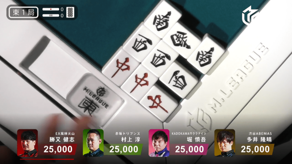 At the start of Katsumata’s 2nd row, he draws the south, which he calls kan with. With the kan, the east kandora indicator is revealed, making the south that Katsumata called kan with become the dora. He misses the rinshan, but the next turn, he switches his 9p tanki wait to a 25p nobetan wait. As everyone else tries to proceed very carefully, Katsumata just draws and discards, waiting for either of his tiles to come out. Then, on Katsumata’s second-to-last tile, Katsumata finds the red 5p to win the hand. Katsumata wins it with Honitsu/Red Dragon/Dora 4/Aka 1 for 8,000 all. This baiman is the 8th baiman of the season and only the 2nd dealer baiman of the season.