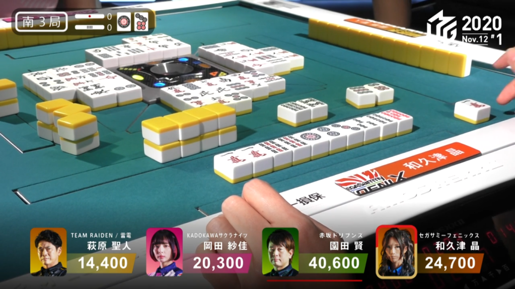 In S3-0, Wakutsu is in 2nd place, but still 15,900 away from taking to spot. Her haipai is decent, holding a dora and a red dora, being 2-shanten for chiitoi. Within the first row, she converted her chiitoi 2-shanten to a standard hand iishanten. Since she was holding four 7p, she calls kan. Revealing the 6p as the kandora indicator, her hand’s potential value suddenly jumps up by 4 han. Through the 2nd row she waits to get to tenpai and finally gets to tenpai at the end of the row. She calls riichi on a 1m/9s shanpon wait, giving her at least 7 han if she wins. A few turns later, she finds the 1m to win the hand. She finds two ura dora for Riichi/Tsumo/Dora 5/Aka 1/Ura 2 for 4,000/8,000. With that hand, she goes to first place and becomes only the second 8 dora hand after Takizawa’s Red Dragon/Dora 7/Aka 1 hand back in 2018.