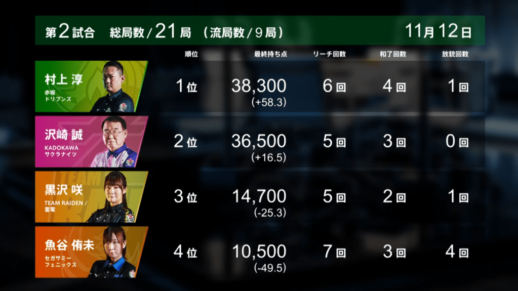 At 2 hours and 53 minutes going through 21 hands, it was the longest game in M-League history. With 9 hands going to ryuukyoku, it ties the record for most ryuukyoku in a single game.
