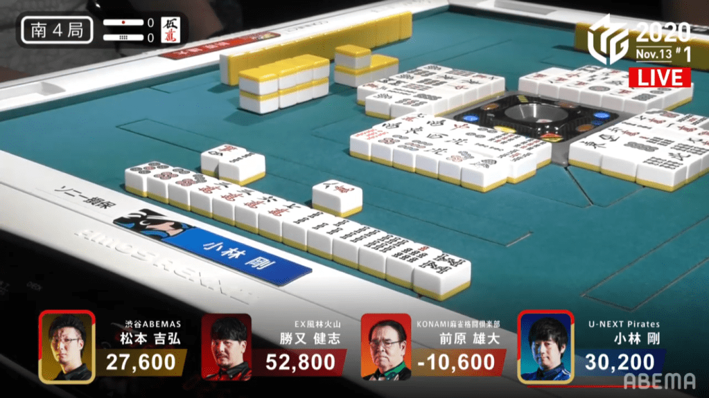 In S4-0, Matsumoto is trying to take 2nd place from Kobayashi, while dealer Kobayashi is looking to keep his 2nd and have a better chance at 1st. Kobayashi starts out with ryanmen shapes, but is 5-shanten from a regular hand with no value. Matsumoto, on the other hand, starts out 2-shanten but lack the value to overcome the 2,600 point difference he needs take 1st. By the end of the 1st row, Kobayashi is still a ways away at 3-shanten, but has his ryanmen waits set up. Matsumoto improves his hand as well to be at iishanten, but still lacking the value he needs. The first of the two to get to tenpai is Kobayashi, calling riichi on a 58m wait for a minimum 5,800 hand. Drawing a red 5 two turns after Kobayashi’s riichi, Matsumoto calls riichi himself and waits on a 25p ryanmen. The two of them wait turn after turn, with Matsumoto waiting for 2nd and Kobayashi waiting to extend his lead. On the last tile, Matsumoto draws the 8m. With the houtei discard, Kobayashi wins the hand with Riichi/Pinfu/Tanyao/Houtei/Ura 1for 12,000.