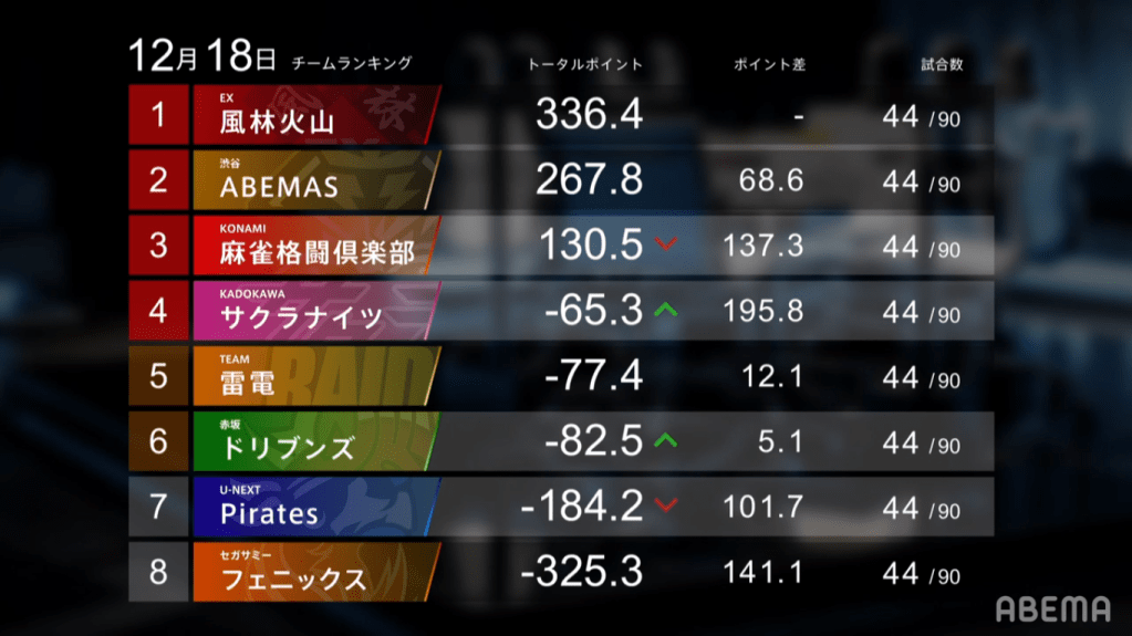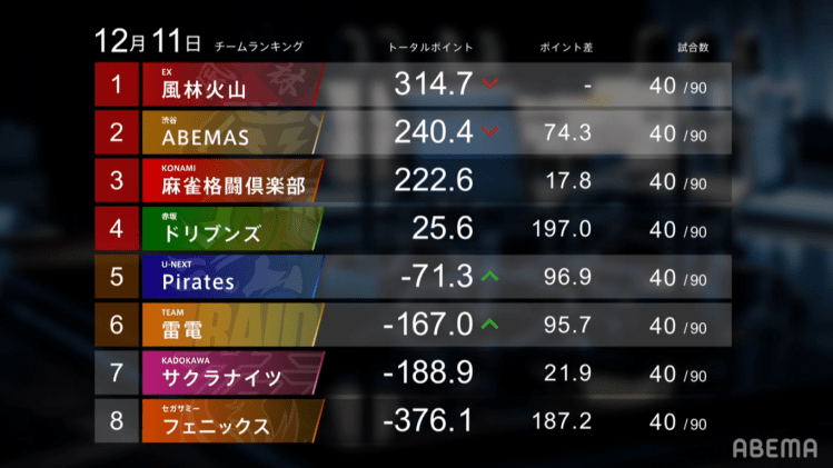 Kadokawa took the top spot in this week’s performance rankings with a +123.6 and a 3-0-0-1 record. It was a team effort, with all four players except for Sawazaki getting 1st. Their high-scoring performance helped them move up to 4th place in the overall rankings and come within one 1st place to getting into the positives. This is the team’s 2nd week in a row with a positive weekly performance.