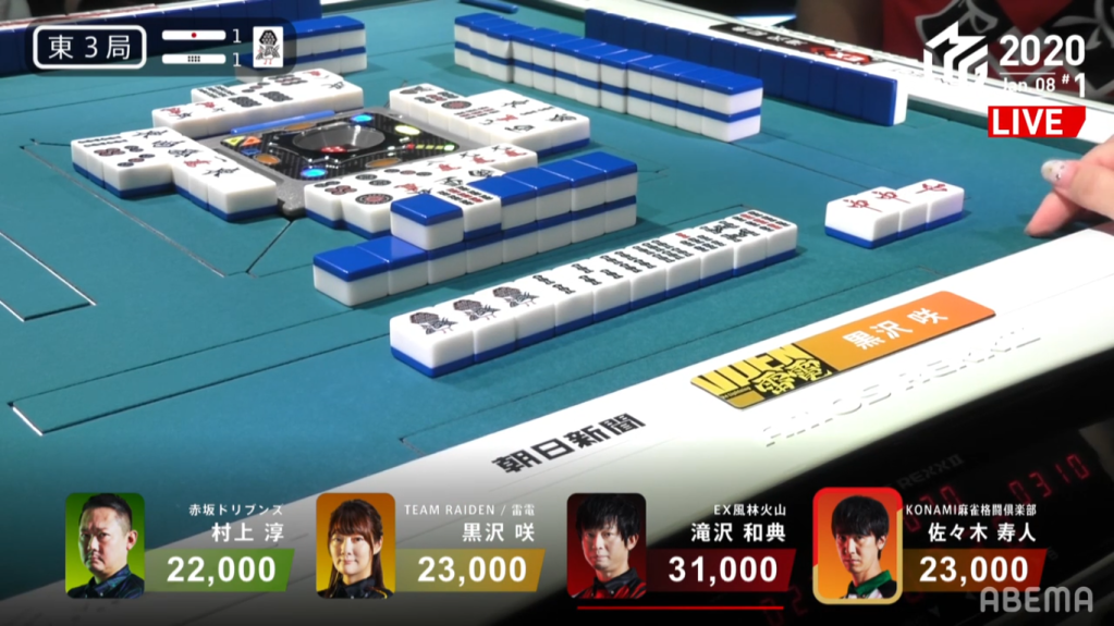 In E3-1, Kurosawa is tied for 2nd place and holds a pair of red dragon and a pair of dora at 3-shanten. Her hand develops well, picking up another dora and getting to iishanten by turn 4. On turn 5, Kurosawa has the option to be tenpai, but chooses to discard her 9m pair to go for a souzu honitsu. In the middle of the 2nd row, Kurosawa makes a rare pon call on the red dragon to put her into a 569s tenpai for haneman. Sasaki tries to chase Kurosawa with a 147p riichi, but he ends up discarding the 9s on his ippatsu turn. Kruosawa wins the hand with Red Dragon/Honitsu/Dora 3 for 12,000+300, along with a leftover riichi stick and Sasaki’s riichi stick.