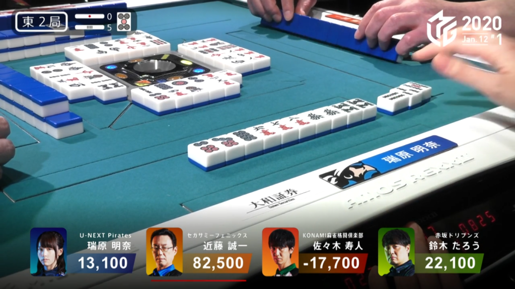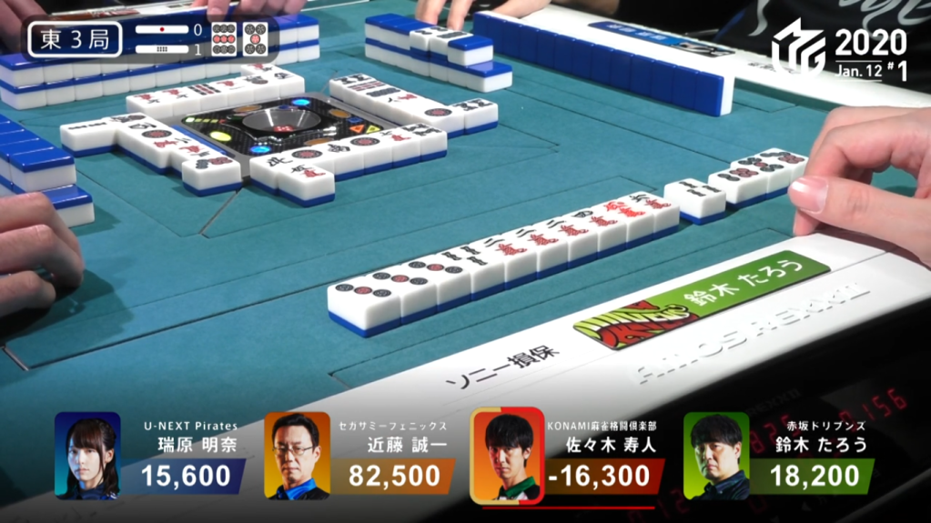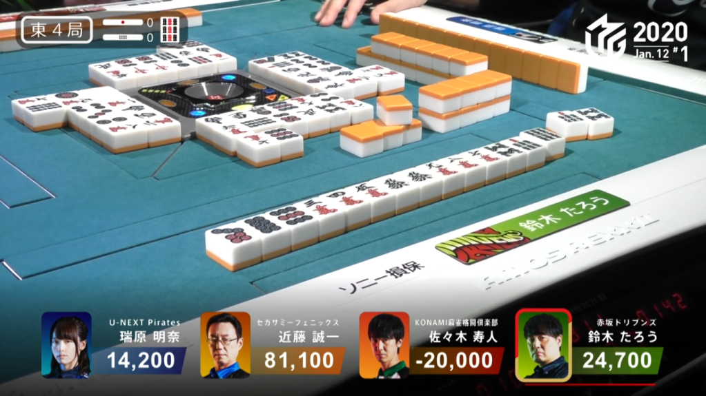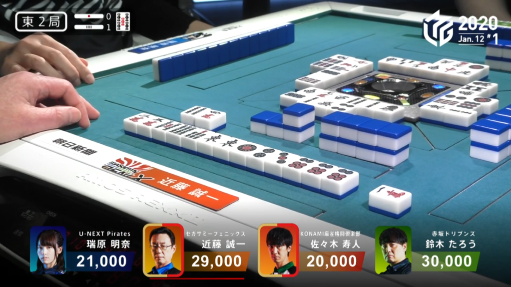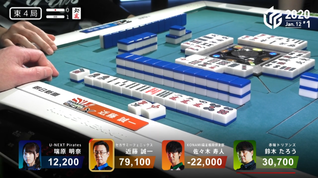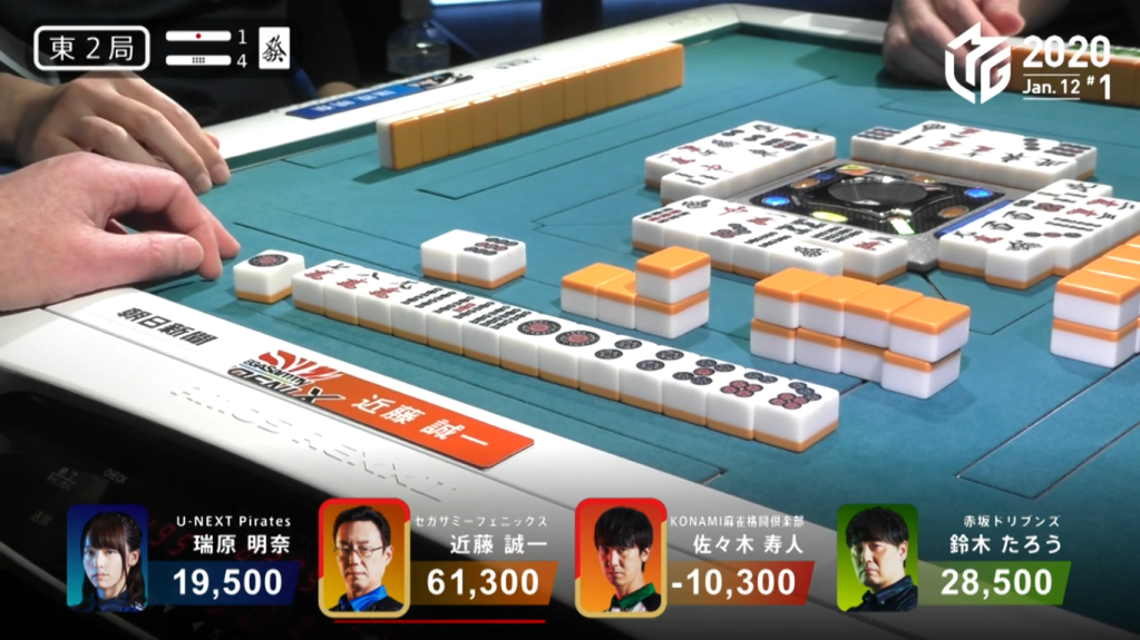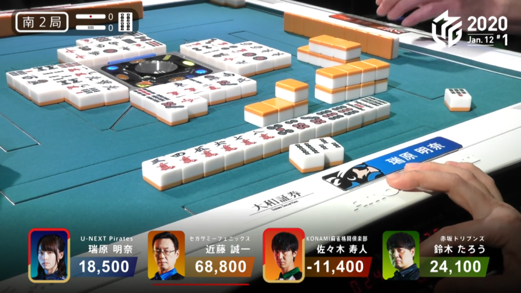 In S2-0, all four players start out 4-shanten. After discarding the usual terminals and honours, everyone had their hands improve greatly, with Taro and Sasaki getting to iishanten by turn 5. The iishanten stall curses the two of them, allowing Mizuhara to catch up to them and build her hand. Near the start of the 3rd row, Sasaki finally gets to tenpai and calls riichi on a 25s ryanmen wait. Trying to rush himself to tenpai, Kondo calls chii to get himself to iishanten and to break Sasaki’s ippatsu. Soon after, Mizuhara gets to tenpai and calls riichi on a 47s ryanmen wait. On Mizuhara’s very next draw, she finds the 7s to win the hand. Mizuhara wins with Riichi/Ippatsu/Tsumo/Pinfu/Ura 1 for 2,000/4,000, plus Sasaki’s riichi stick. This win puts her into 2nd place ahead of Taro.