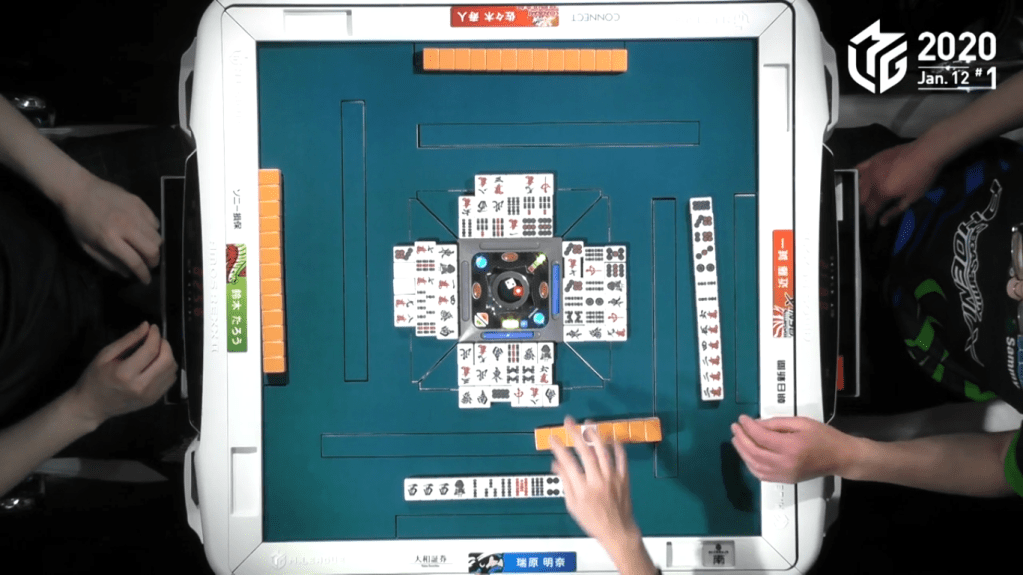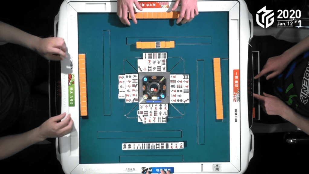 In E3-1, Sasaki starts out with a 2-shanten hand filled with bad shapes while Kondo and Taro start out 3-shanten. On turn 2, Taro shapes his hand to be tanyao based, converting his lone terminal block. By turn 4, Sasaki is down to iishanten and tries to get to tenpai by calling kan on turn 5. The gamble pays off, with the 6s rinshan filling one of his kanchan and letting Sasaki call riichi on a 5p kanchan wait. Taro, who has two dora in his hand, calls chii on Sasaki’s riichi tile to get him to iishanten. Two turns later, Taro gets to tenpai and waits with a 3s tanki wait. On his very next turn, he draws the 3s to win the hand. Taro wins with Tanyao/Dora 2 for 1,300+100/2,600+100. This is one of the rare times when an open tanyao hand gets to 40 fu, with Taro doing so with two concealed ankou of inside tiles and winning by tsumo on a tanki.