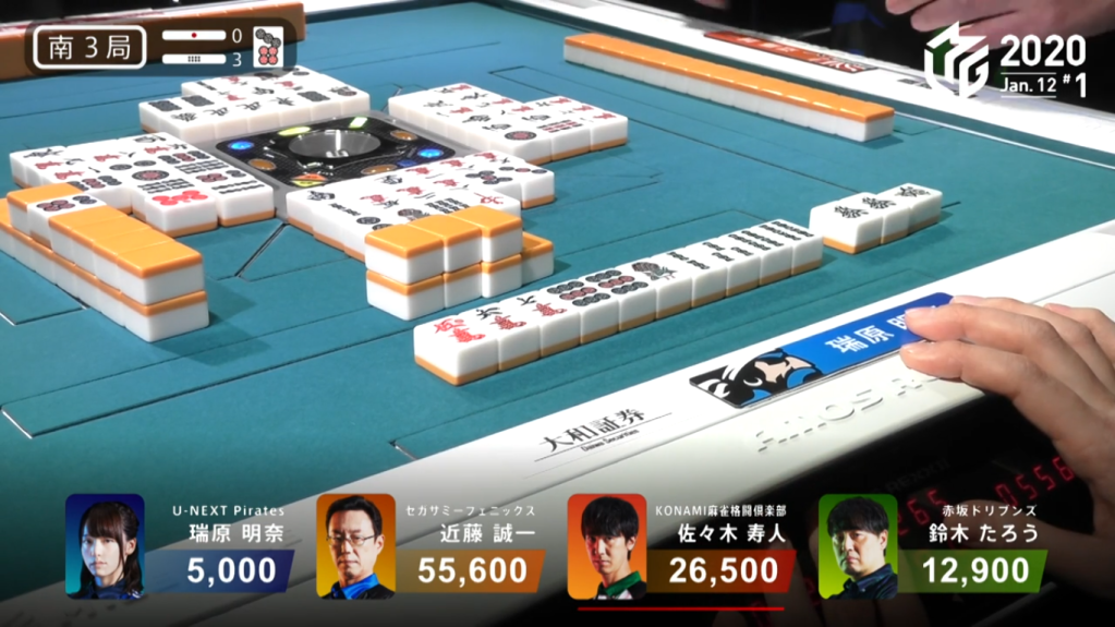 In S1-3, Kondo starts out 2-shanten with a pair of red dragons, while Sasaki starts out 4-shanten with a hand with tanyao or pinfu possibilities. By turn 4, Sasaki has all his ryanmen shapes ready, but is missing his pair. On turn 5, Kondo gets to iishanten and on turn 6, he gets to tenpai and calls riichi on a Red Dragon/West shanpon wait. During Kondo’s ippatsu turn, Sasaki pairs up his single dora to find his pair and get to iishanten. Mizuhara, who had little value and a small chance at winning, decides to call for tenpai and wait on a 1m/White Dragon atozuke wait, with the white dragon the only tile to give a yaku. A turn after Sasaki had gotten to iishanten, he gets to tenpai and calls riichi on a 47s ryanmen wait for mangan. In Sasaki’s ipptasu round, Kondo draws the 7s and deals into Sasaki. Sasaki wins the hand with Riichi/Ippatsu/Pinfu/Dora 2/Aka 1/Ura 1 for 12,900. He also takes along with him Kondo’s riichi stick and the two riichi sticks left over from the previous hand.