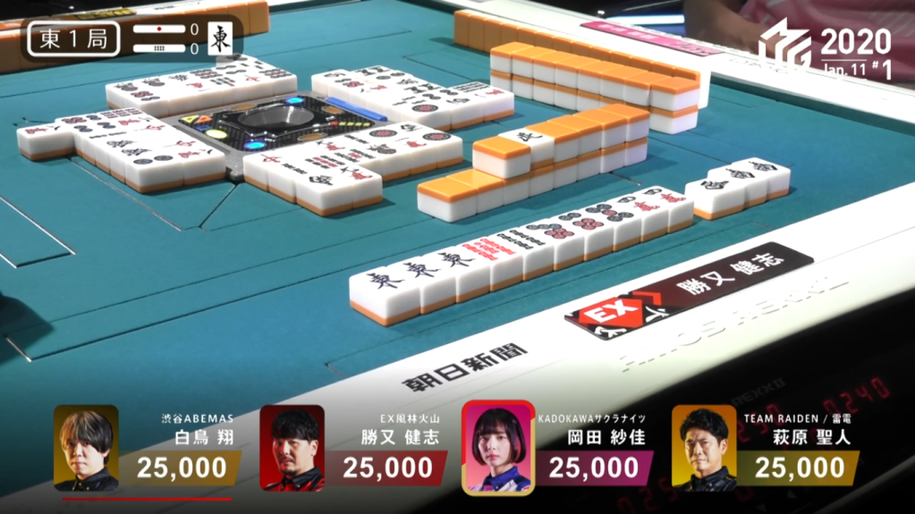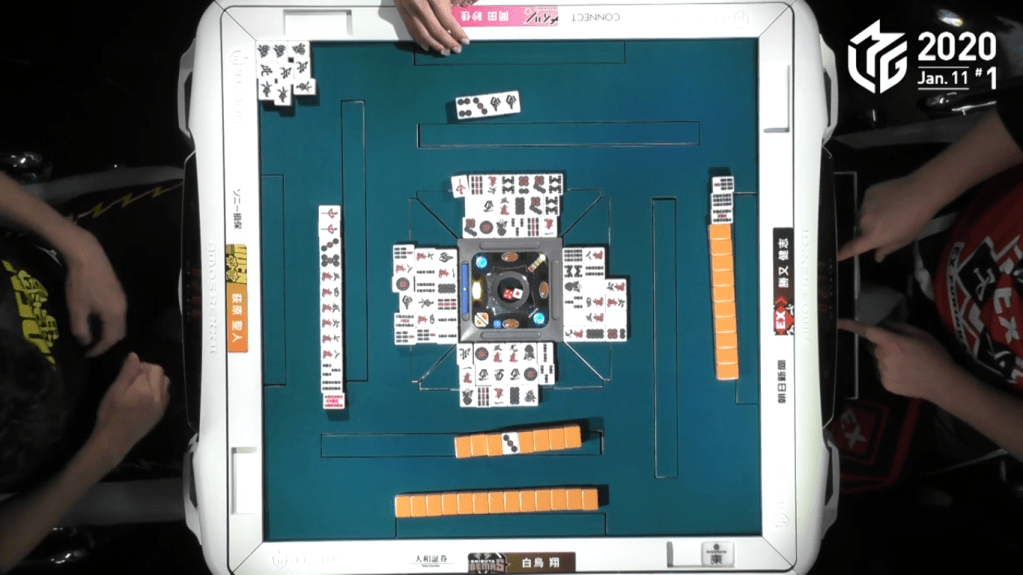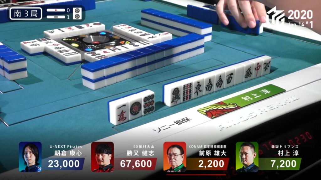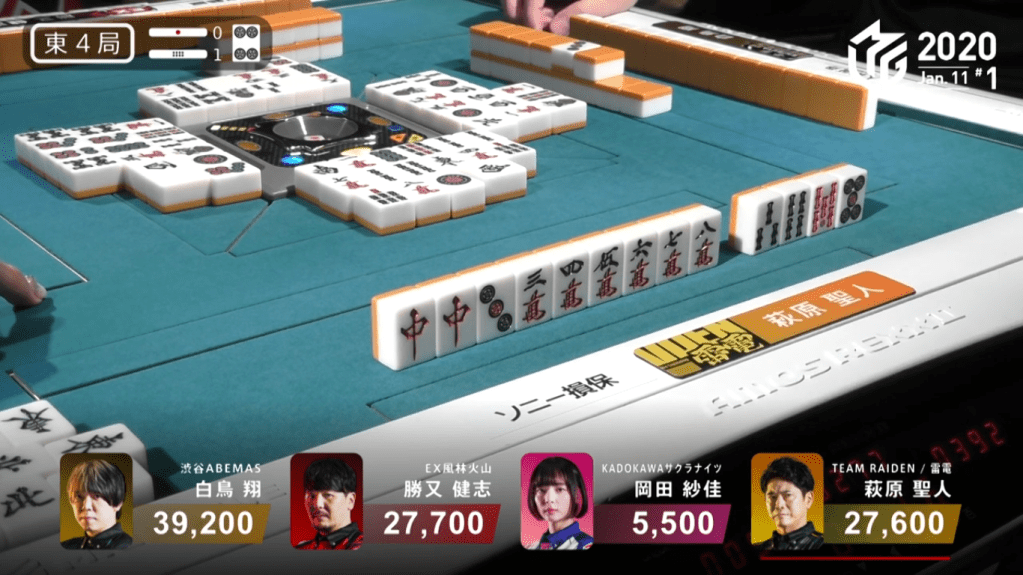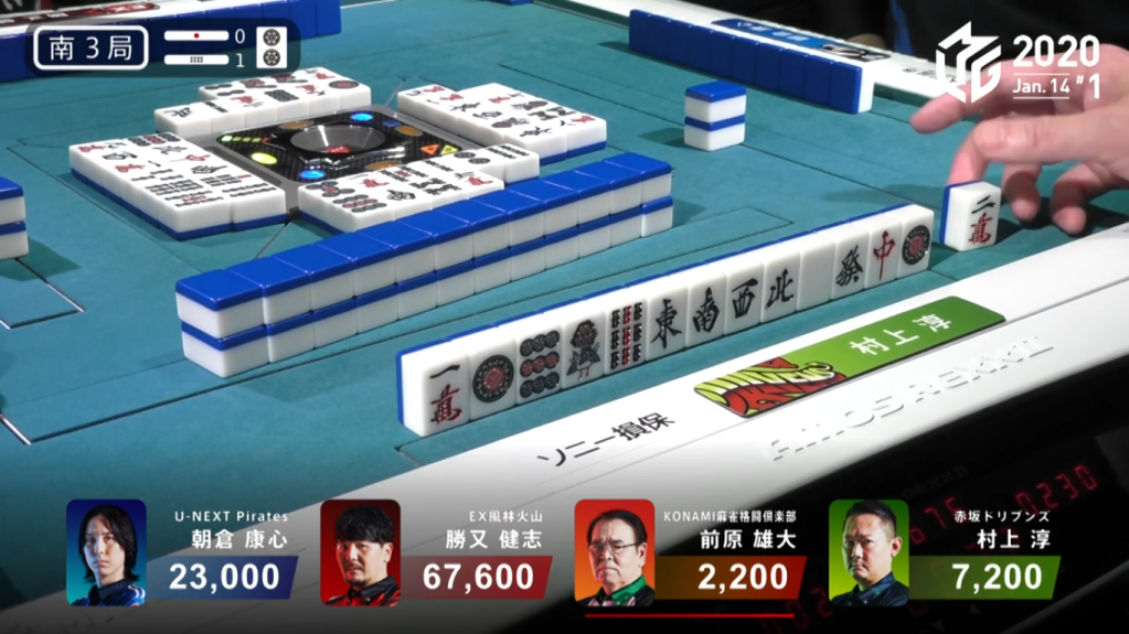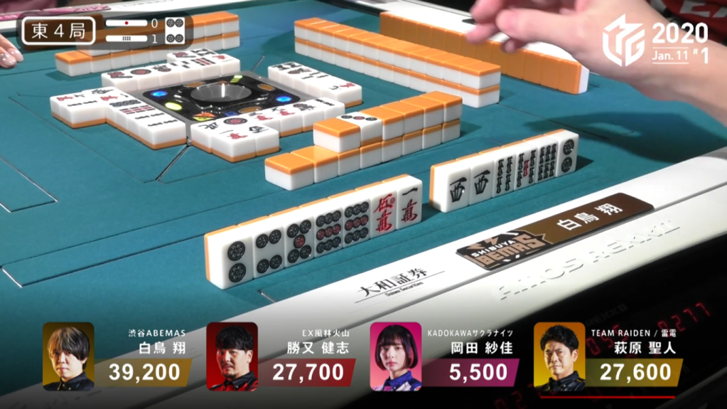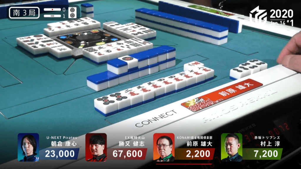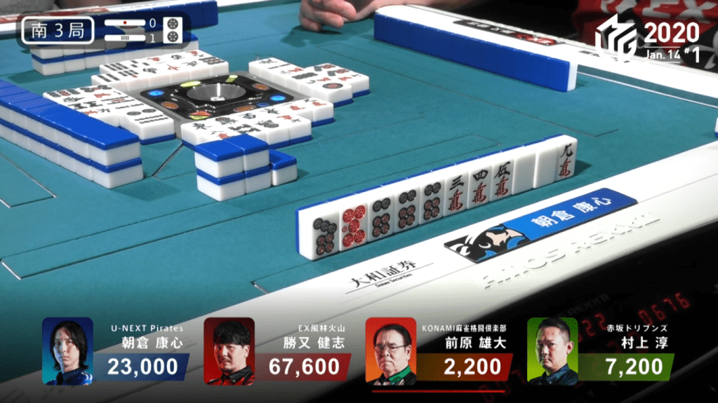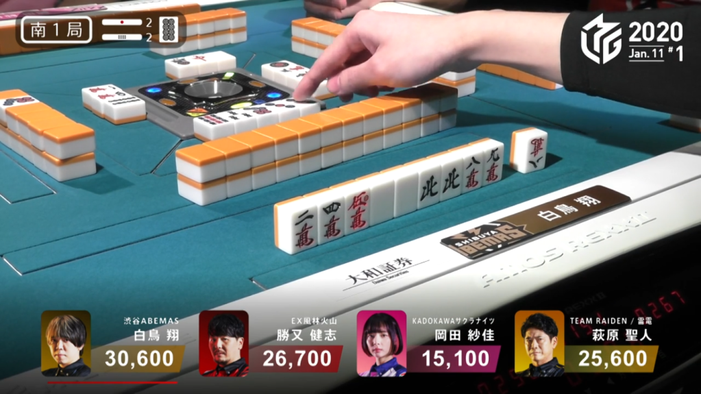 After 20 seconds of deciding, Asakura safely escapes the situation by discarding the white dragon.
