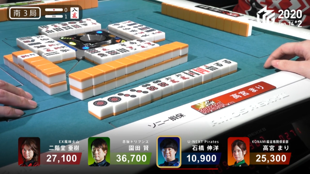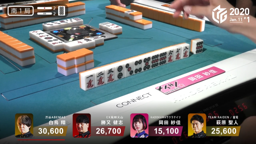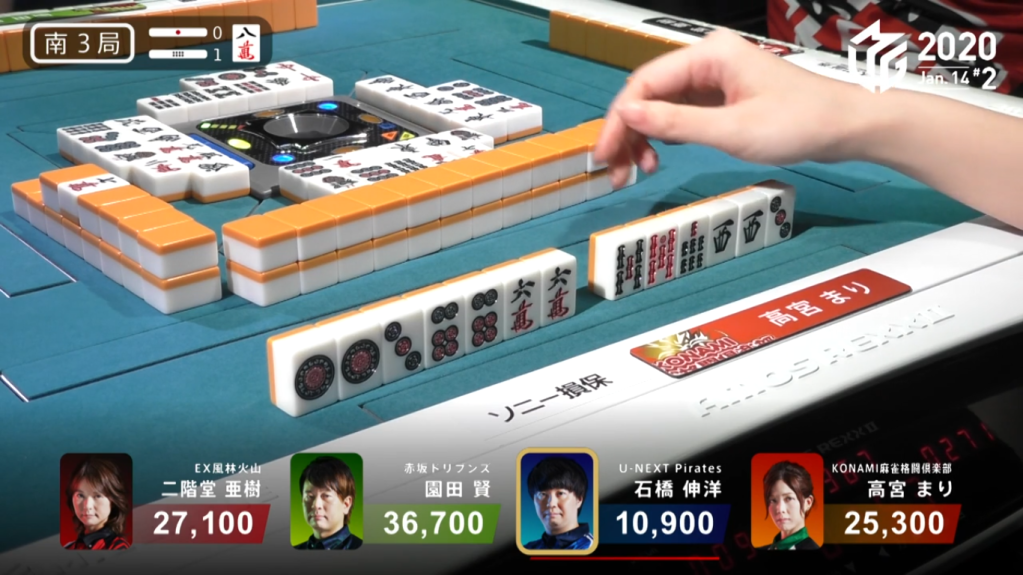 Within the first row, she calls pon on the green dragon, the south and and the east. With Okada showing a dangerous hand, Shiratori did something that was surprising to many people: he discarded the west.