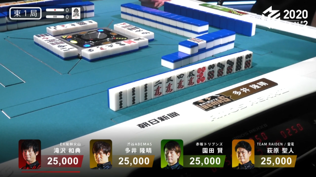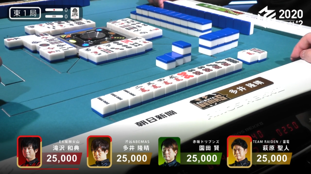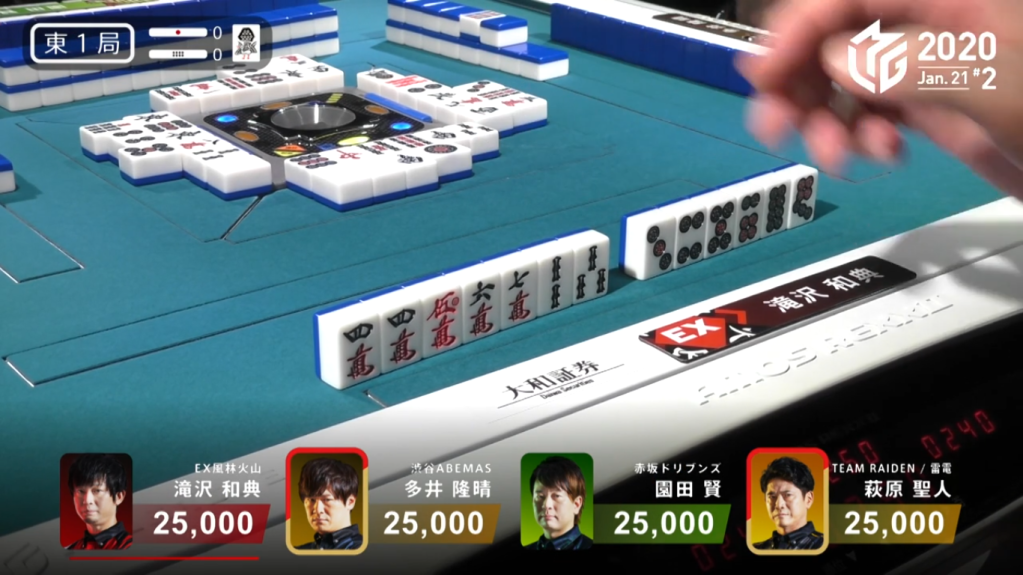 In E1-0, Hagiwara has the best starting hand, being iishanten with a dora. As with many iishanten hands, Hagiwara’s hand stalls while Takizawa and Ooi start to catch up. By turn 5, Ooi is iishanten as well with a wide wait to tenpai. On turn 6, Takizawa also gets to iishanten. Immediately after Takizawa gets to iishanten, Ooi gets to tenpai and calls riichi on a 25m nobetan wait. Near the start of the 2nd row, Hagiwara also gets to tenpai and calls riichi on a 6m kanchan. Two turns later, Takizawa calls the 3rd riichi and waits with a 14s ryanmen wait. With Sonoda bailing to the best of his ability, it became a tsumogiri battle between the three riichi players. At the start of the 3rd row, Takizawa draws and discards the 5m and deals into Ooi. Ooi wins the hand with Riichi/Tanyao/Aka 1/Ura 1 for 8,000, also taking Hagiwara’s and Takizawa’s riichi stick.