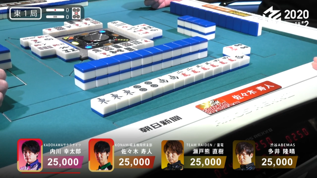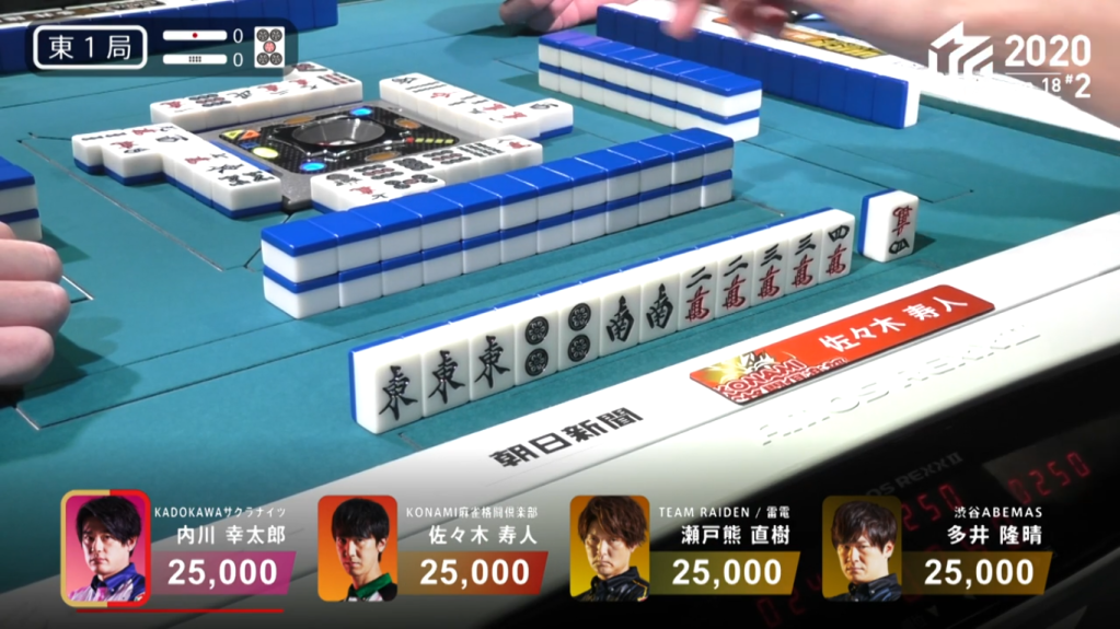 In E1-0, dealer Uchikawa and Sasaki both start out with a 3-shanten hand, with Uchikawa holding dora and a pair of red dragons, while Sasaki holds a dora and an east ankou. The first row is generous to both of them, with Uchikawa and Sasaki getting to iishanten. Near the start of the 2nd row, Uchikawa makes his red dragon pair into an ankou and calls riichi on a 47p ryanmen wait for 7,700 minimum. Immediately after, Sasaki has a chance to get to tenpai, but would need to throw the dora in order to achieve it. Without hesitation, Sasaki throws it and calls riichi on a 2p/South shanpon. Two turns later, Sasaki draws the south himself to win the hand. Sasaki wins the hand with Riichi/Tsumo/Iipeikou/East/South for 2,000/4,000, plus Uchikawa’s riichi stick.