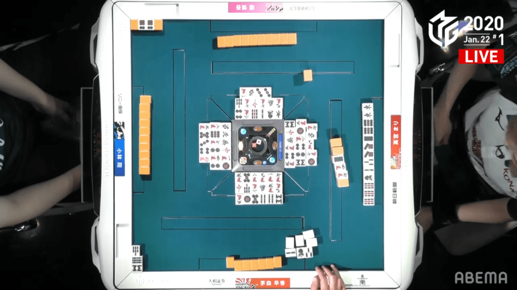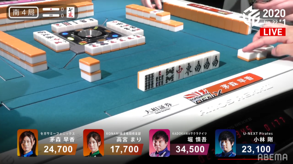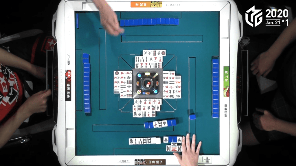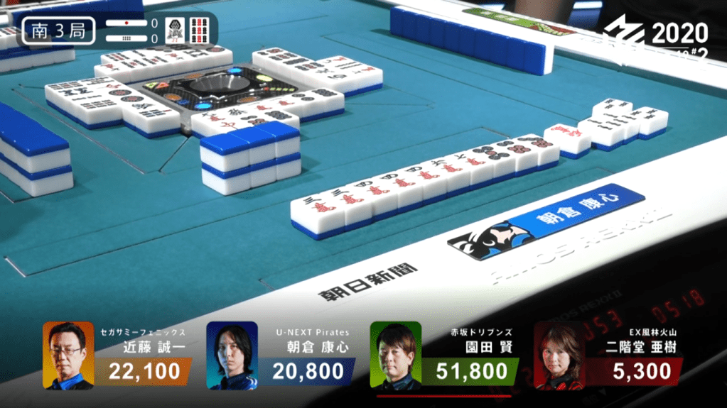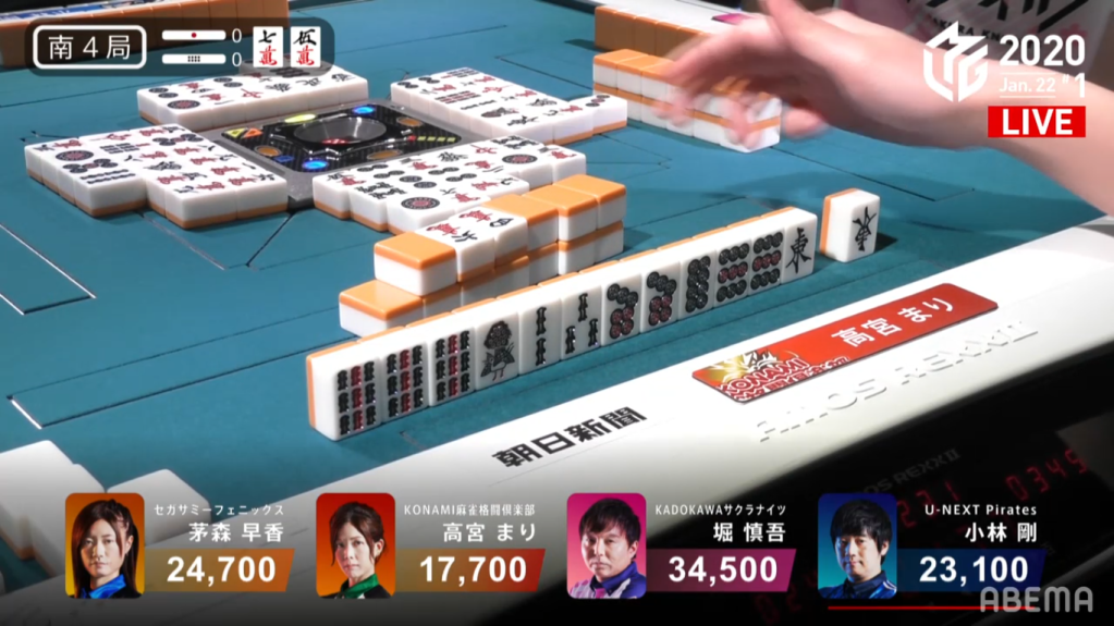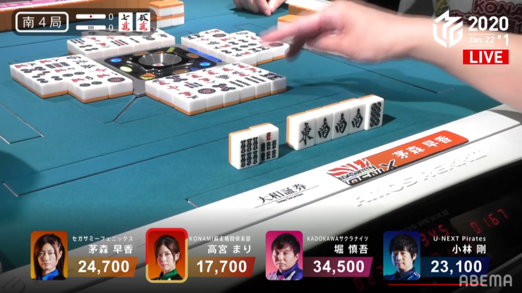 In S4-0, the scores are close. 4th place Takamiya is 5,400 away from 3rd place dealer Kobayashi, who is 1,600 away from 2nd place Kayamori, who is 9,800 away from 1st place Hori. Both Kobayashi and Kayamori are withing a mangan tsumo of 1st, while Takamiya is a mangan away from 2nd. Kayamori starts out with a very valuable starting hand, being iishanten with a double south ankou and a pair of white dragons. Both Kobayashi and Takamiya have poor but manageable hands. On turn 3, Kayamori breaks her iishanten to aim for honitsu, making a mangan guaranteed. Soon after, Kayamori calls chii to put her back to iishanten and calls pon to get to tenpai on an east tanki wait. By the end of the 1st row, Takamiya is 2-shanten for junchan and a possible iipeikou is she keeps her hand closed. Seeing the rush with Kayamori’s hand, Kobayashi tries to rush his own hand by calling chii to get him to iishanten. In the middle of the 2nd row, Kobayashi gets to tenpai on a 14s ryanmen wait, but the 1s won’t give him a yaku. Right after, Kayamori calls kan on the white dragon for another chance to draw. She misses and gives Kobayashi another dora with the kan. A turn later, Kobayashi draws a souzu tile. With Kayamori appearing to have a souzu honitsu, Kobayashi discards his 2p pair to keep safe. Near the start of the 3rd row, Takamiya draws the east.