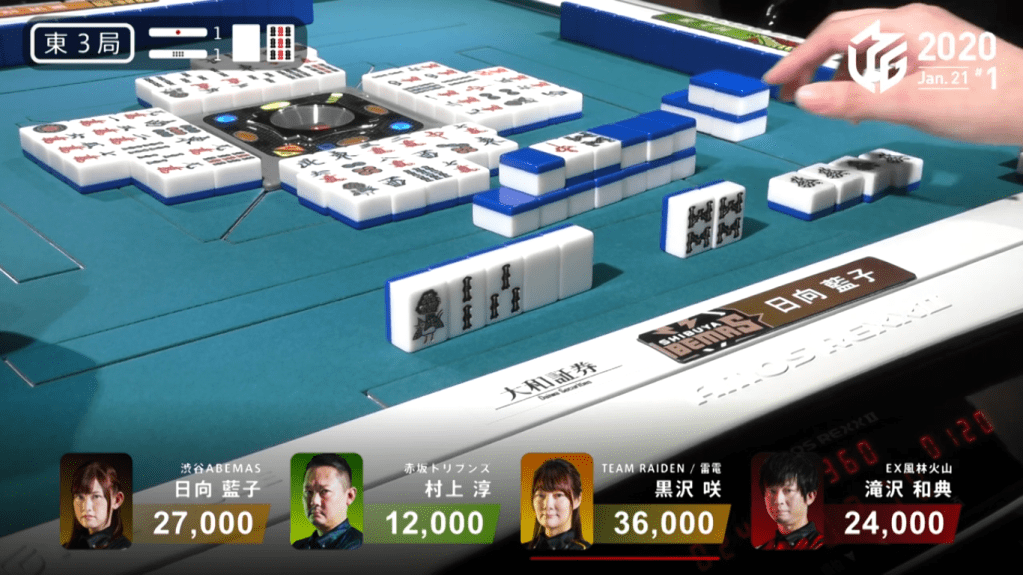 In S4-0, Aki is in 4th place after dealing into Kobayashi while in riichi last hand. Being 10,200 away from first place dealer Kobayashi, she would need a 3/40 direct hit, a haneman indirect hit or a mangan tsumo to take 1st place. Aki starts out with a 4-shanten hand and lacks any value. In her first fer turns, she increases he hand value by drawing a red dora and gets closer to tenpai, getting to 2-shanten by turn 3. Her hand stalls a bit, but in the middle of the 2nd row, she fills in a kanchan to get to a perfect iishanten shape. Two turns later, Aki gets to tenpai and calls riichi on a 47s ryanmen wait. Her hand, which only has 2,600 points confirmed, is a bit of a gamble. She needs to find one other han besides tsumo, whether ippatsu or the dora 4s or uradora, to get her to 1st. If she doesn’t it’s not enough to get her out of 4th. However, luck came her way and she drew the dora 4s on her ippatsu turn. Revealing one uradora, Aki wins the hand with Riichi/Ippatsu/Tsumo/Dora 1/Aka 1/Ura 1 for 3,000/6,000 to win the game. With Kobayashi only 2,800 points ahead of 2nd place Uotani at the start of the round, the dealer penalty caused him to drop down to 3rd, missing 2nd place by 200 points.