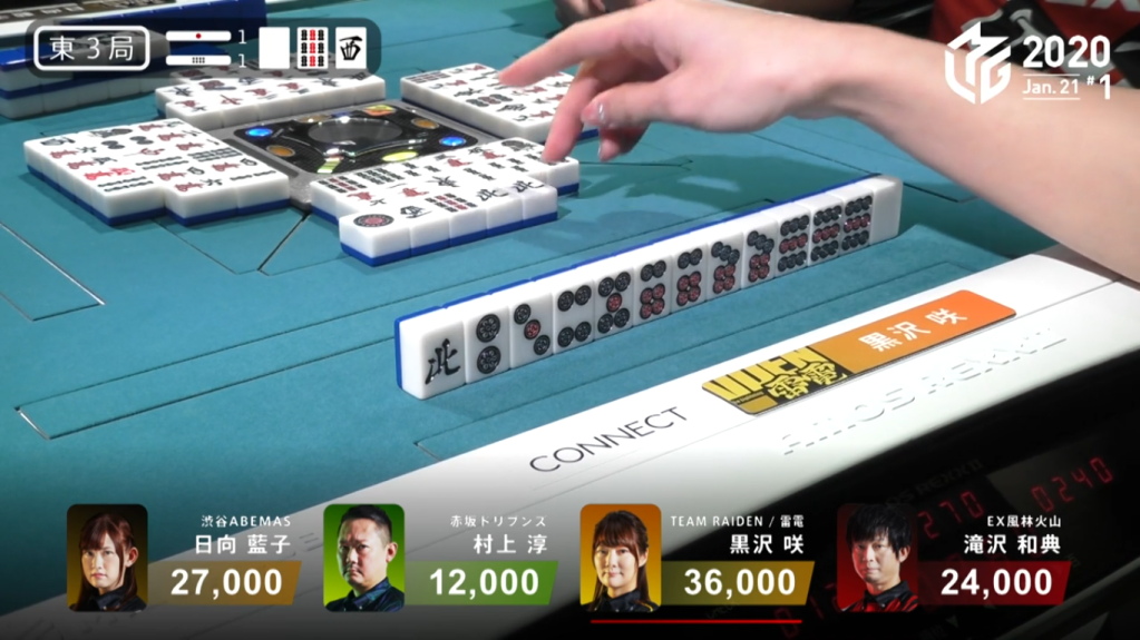 In E1-0, Kurosawa starts out with a hand with 3 pairs and an ankou. With the pairs being near the middle, it’s natural for her hand to lean more to chiitoi than to toitoi. On turn 2, she makes a pair of her 1p dora to put her iishanten for chiitoi. Through the next few turns, she holds onto her ankou in the off case that another ankou forms. Near the start of the 2nd row, Kurosawa draw another pair to get to tenpai. She calls riichi and waits on the white dragon, a very trick wait since there are already two of them out on the board. When Murakami draws the white dragon two turns later, he instantly discards it and deals into Kurosawa. Kurosawa wins the hand with Riichi/Chiitoi/Dora 2/Aka 1 for 12,000.