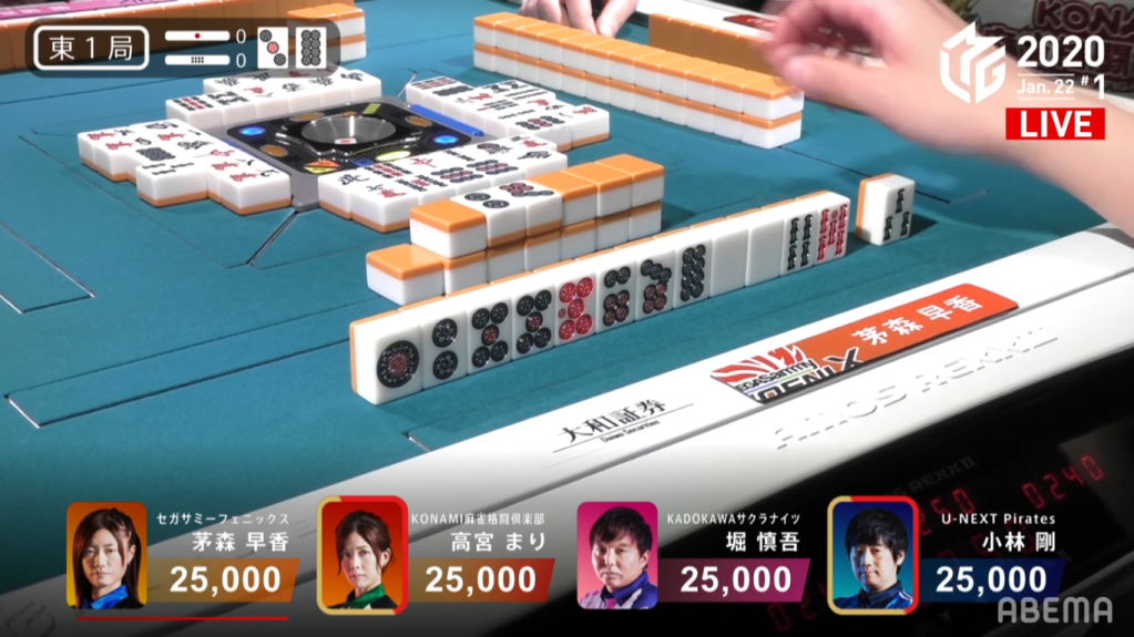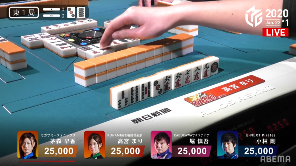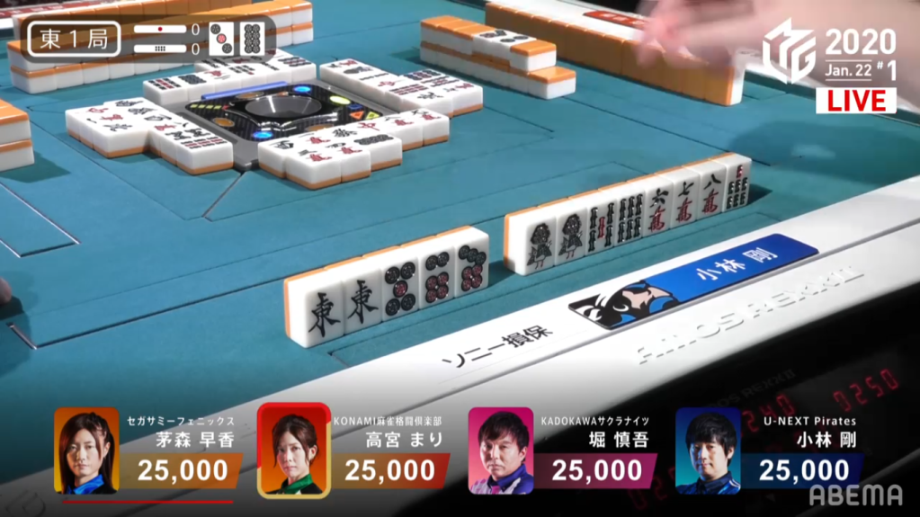 In E1-0, Kobayashi starts out with the closest hand at 2-shanten. Through the first row, all the players had their hands improve, with everyone except for Kayamori getting to iishanten by the end of the 1st row. The first of them to get to tenpai is Takamiya, who does so after calling a kan and waits on a 2p kanchan wait. Two turns later, Kobayashi gets to tenpai and calls riichi on an East/1s shanpon wait. Two turns after that, dealer Kayamori calls the 3rd riichi and waits on a 3p dora penchan wait. Immediately after, Takamiya discards the east and deals into Kobayashi. Kobayashi wins the hand with Riichi/East for 2,600 and taking the two other riichi sticks on the table.