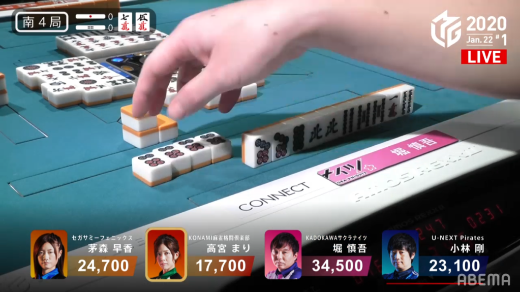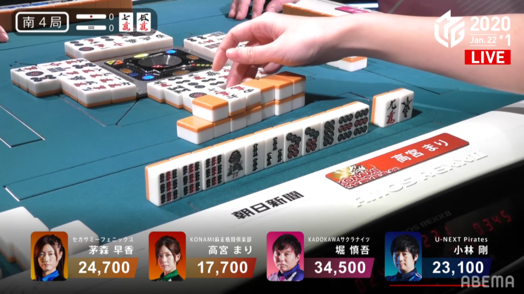 With the danger of 4th place, both Hori and Kobayashi fold. When Kayamori draws the 8p, she is forced to fold as well.