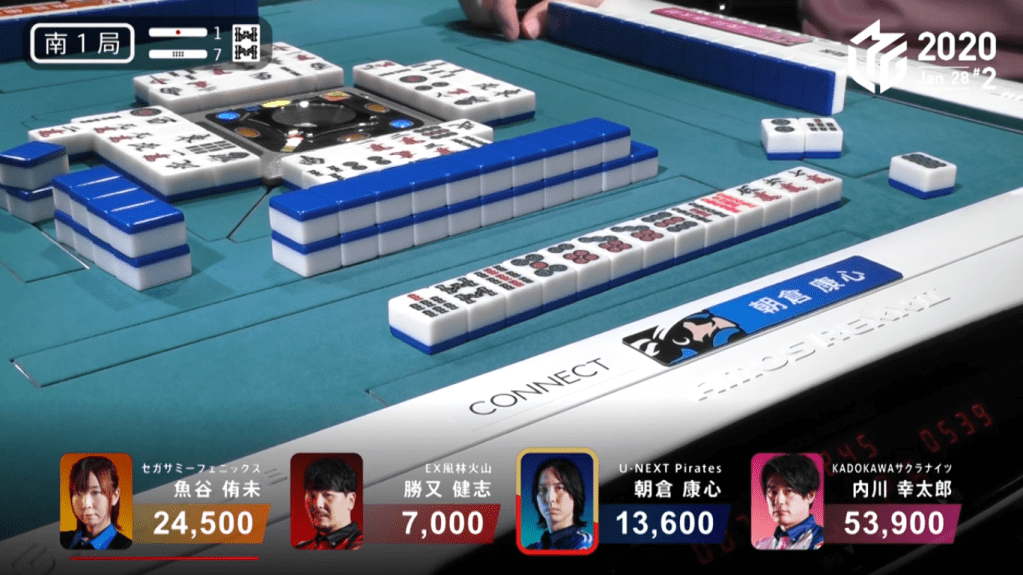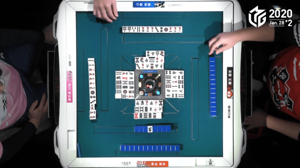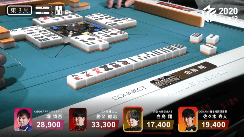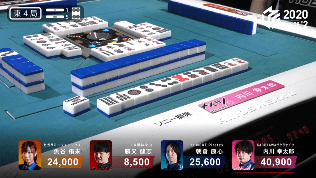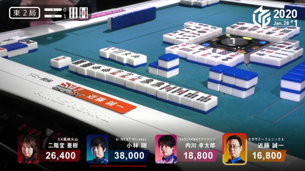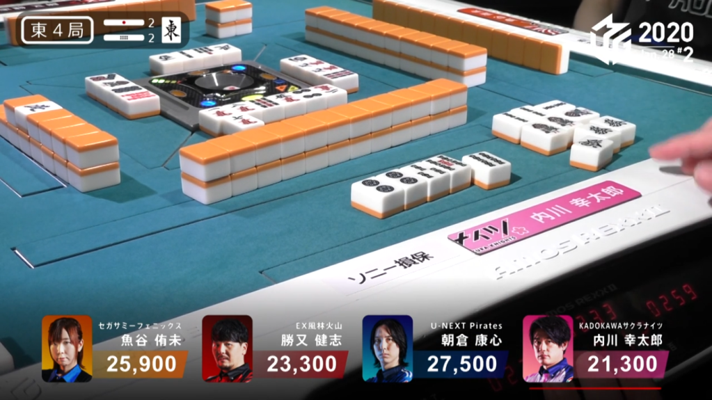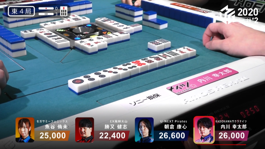 Game 2 on January 28 (Game 130 of the season) had one of those rare high honba counts. It all started on Asakura’s dealer when poor draws and a late riichi from Katsumata caused the hand to go to ryuukyoku with Katsumata the only one in tenpai.