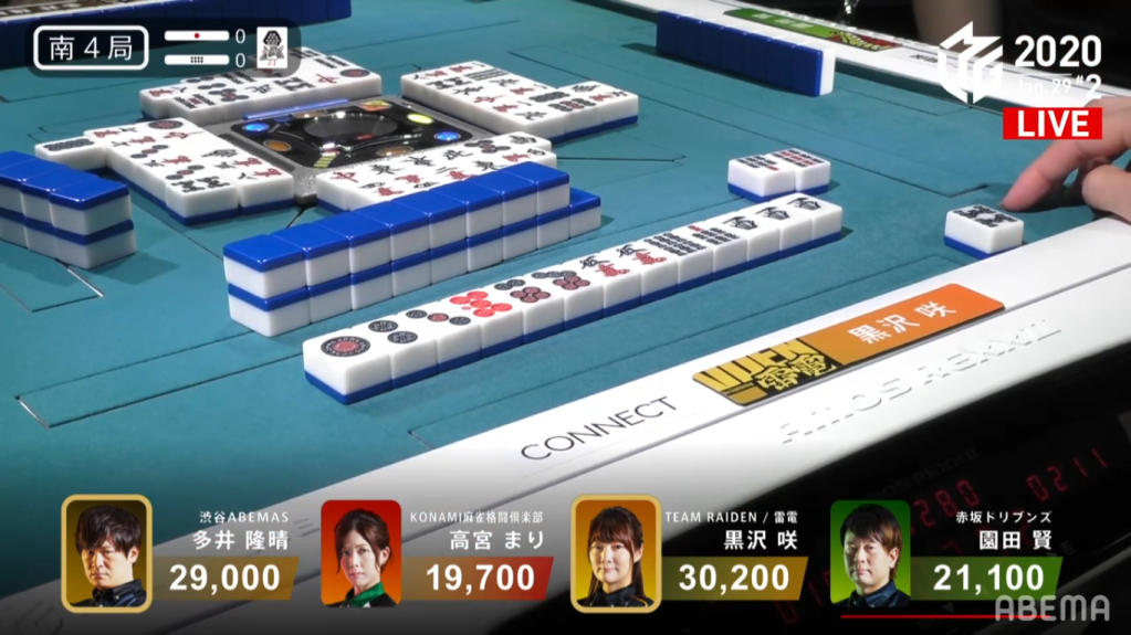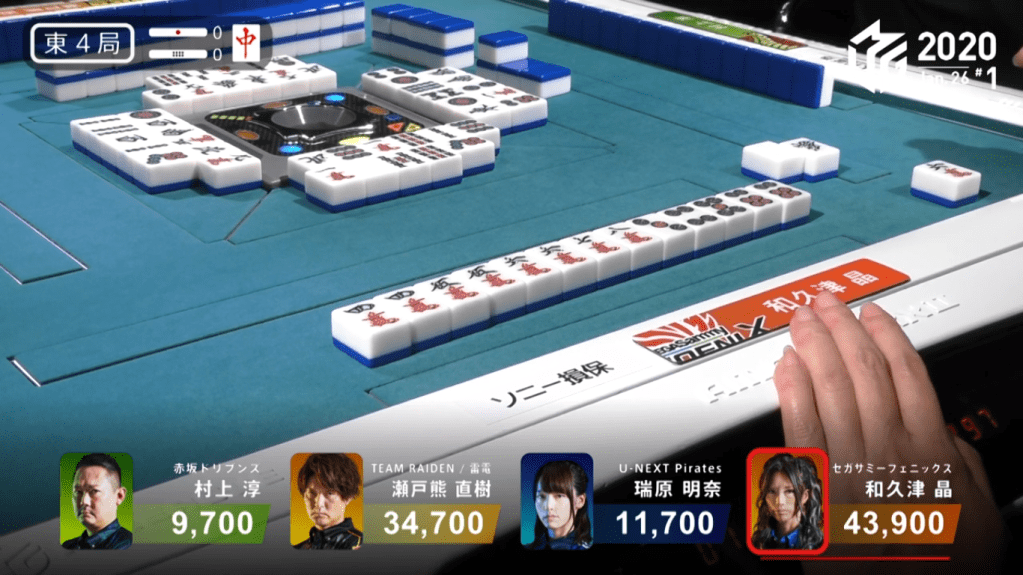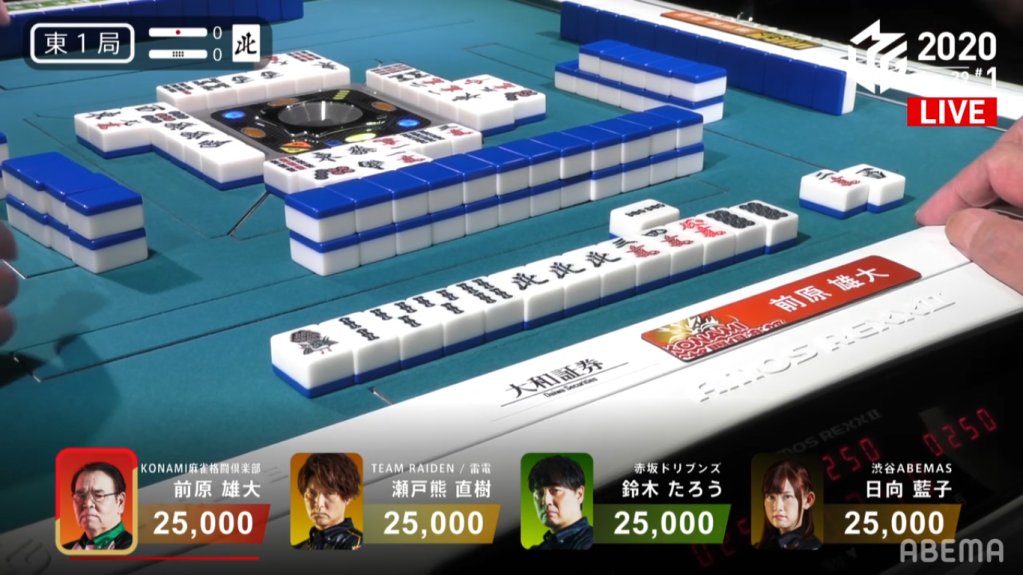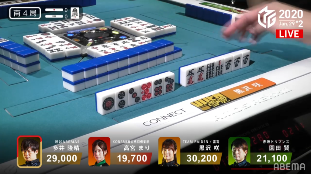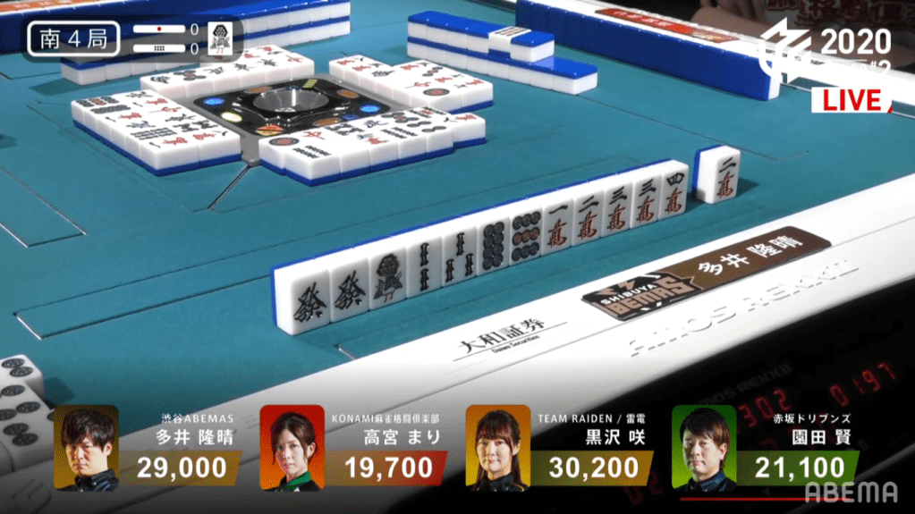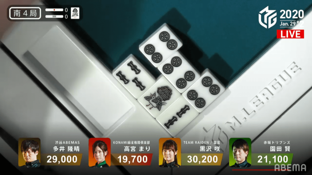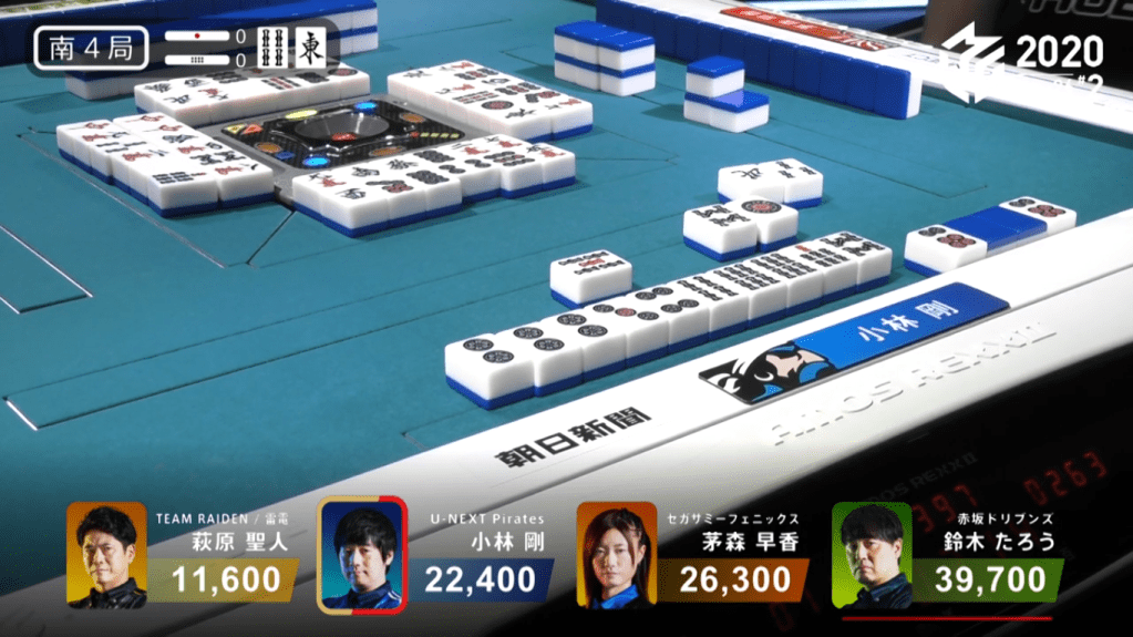Game 2 on January 28 (Game 130 of the season) had one of those rare high honba counts. It all started on Asakura’s dealer when poor draws and a late riichi from Katsumata caused the hand to go to ryuukyoku with Katsumata the only one in tenpai.