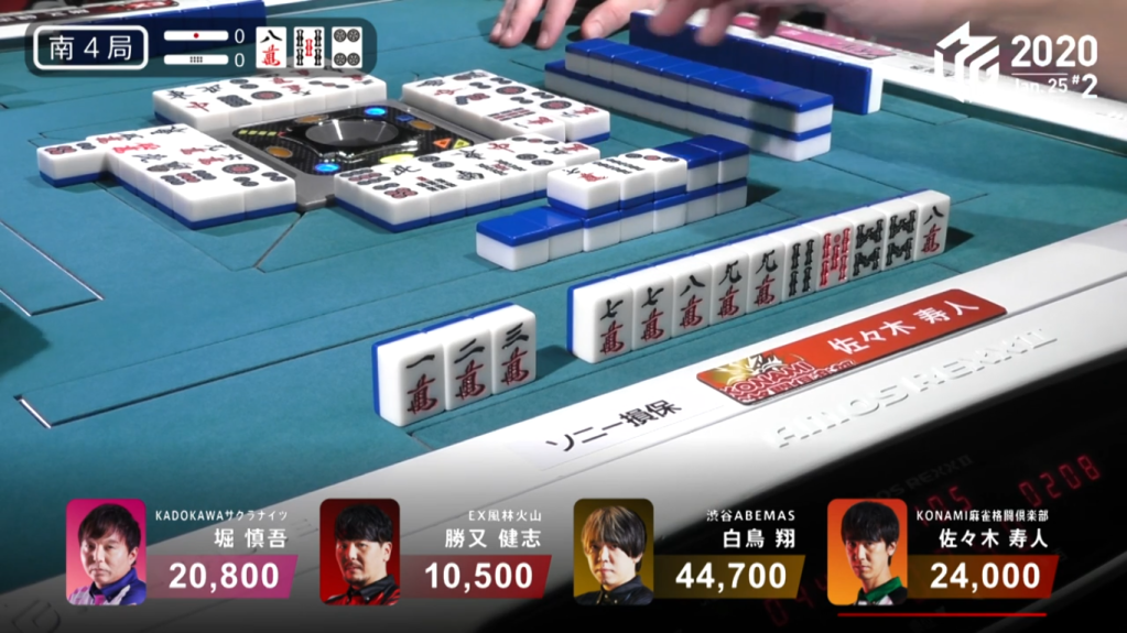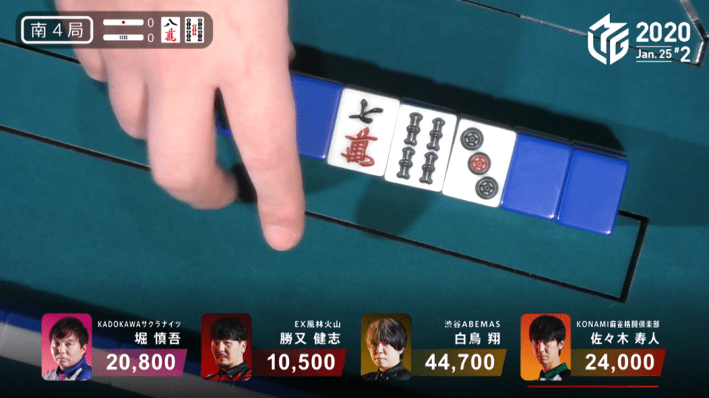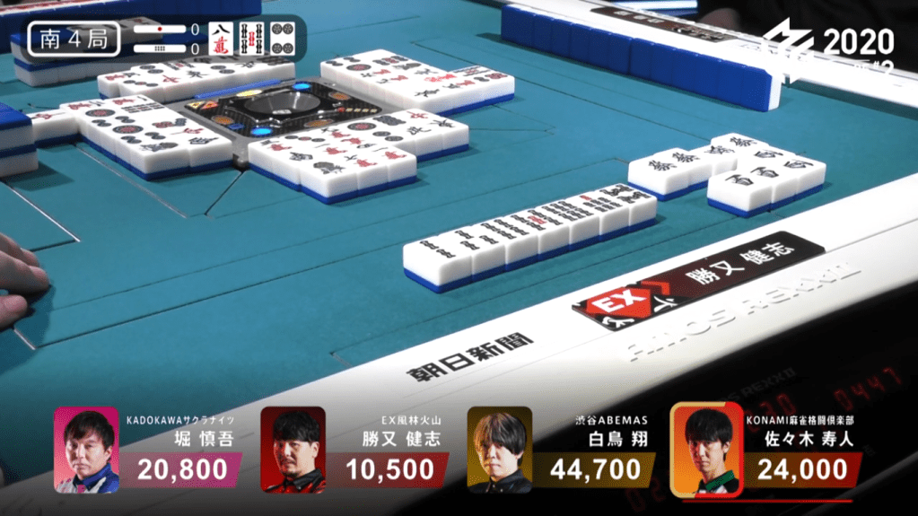 In S4-0, Katsumata is in last place and 10,300 behind 3rd place Hori and 13,500 behind 2nd place dealer Sasaki. In order to get out of 4th, Katsumata would need a 3/40 direct hit or haneman general ron or tsumo. His hand doesn’t start out with much promise, being 4-shanten with only a pair of green dragons and wests for value. When a west comes out on the first turn, Katsumata calls pon and breaks up his lone pinzu block, making it clear that he’s aiming for honitsu. The turn after, he makes an ankou of the green dragon to put him 3-shanten from mangan. In the middle of the 1st row, Sasaki discards the green dragon and Katsumata calls kan, a rare and desperate move in order to find more points. With the kan, it makes the 5s a dora, a tile that can easily be incorporated into Katsumata’s honitsu hand. By the end of the 1st row, Katsumata is iishanten. At the start of the 2nd row, Katsumata draws a 5s to get him to 5 han and a potential for a 3-sided wait. At the start of the 3rd row, Katsumata finds the 3s he needs to get to tenpai on a 3-sided wait. He chooses the 258s wait instead of the 147s in the small chance that he draws the 5s to get him to haneman for 2nd place. The very next turn, Katsumata draws the west and calls kan. The rinshan misses and Katsumata is back to waiting.