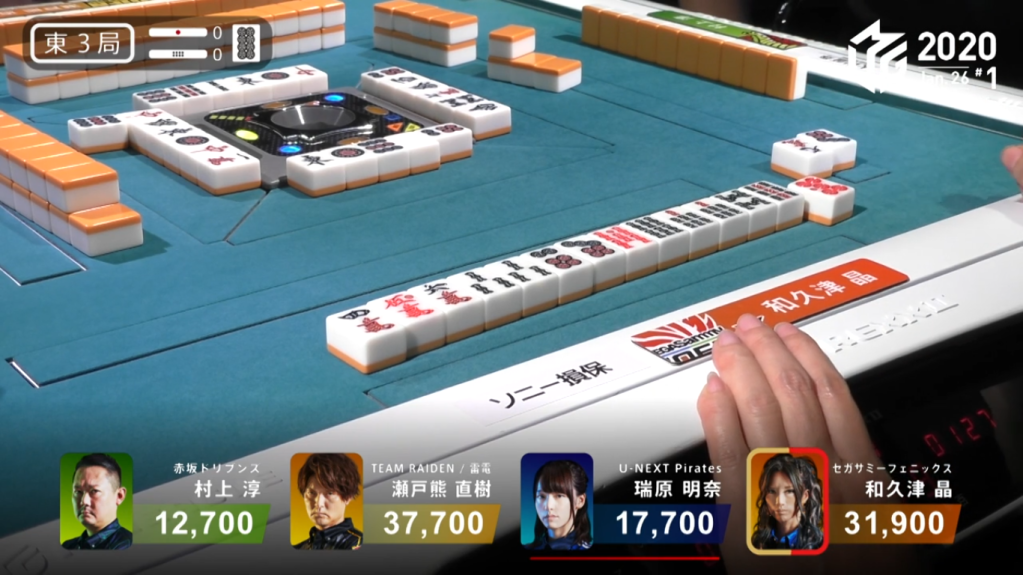 With three dora indicators now and Sasaki getting to tenpai, he calls riichi with a 36s ryanmen wait, trying to take advantage of the extra uradora chances. On Shiratori’s draw, he senses the potential danger of losing his 1st to dealer Sasaki.
